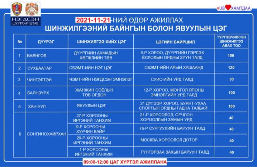 • Хан-Уул дүүрэгт 21 дүгээр хороо, Буянт-Ухаа спортын ордны гадна талбайд явуулын цэг ажиллана.