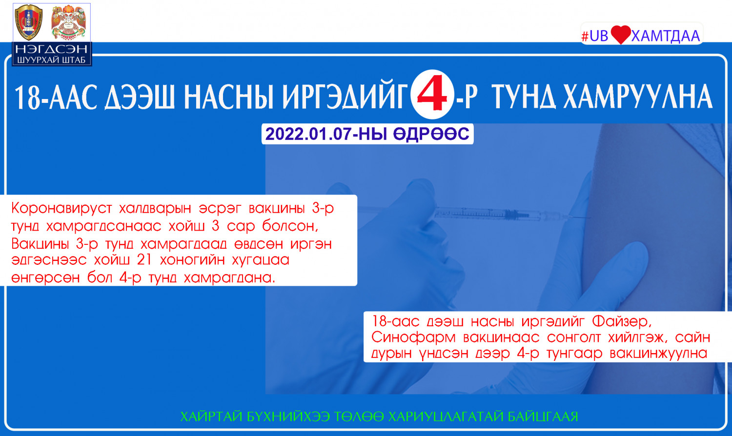 Коронавируст халдварын эсрэг вакцины дархлаа сэргээх нэмэлт 3 дахь тунд хамрагдаад гурван сарын хугацаа өнгөрсөн 18-аас дээш насны иргэд вакцины 4 дүгээр тунд сайн дурын үндсэн дээр хамрагдах юм. Мөн нэмэлт 3 дахь тунд хамрагдаад өвдсөн иргэн эдгэснээс хойш 21 хоногийн хугацаа өнгөрсөн бол 4 дүгээр тунд хамрагдах боломжтой юм. Дээрх шалгуурт нийцсэн иргэд Файзер үйлдвэрийн “Комирнэти”, Синофарм үйлдвэрийн “CorV” вакцинаас сонголт хийх боломжтой. Түүнчлэн энэ жил 12 нас хүрч буй 2010 онд төрсөн хүүхдүүд коронавируст халдварын эсрэг вакцины эхний тунд хамрагдаж эхлэх юм байна. Мөн энэ жил 18 нас хүрч байгаа иргэн дархлаажуулалтын нэмэлт 3 дахь тунд хамрагдаж болох аж.
