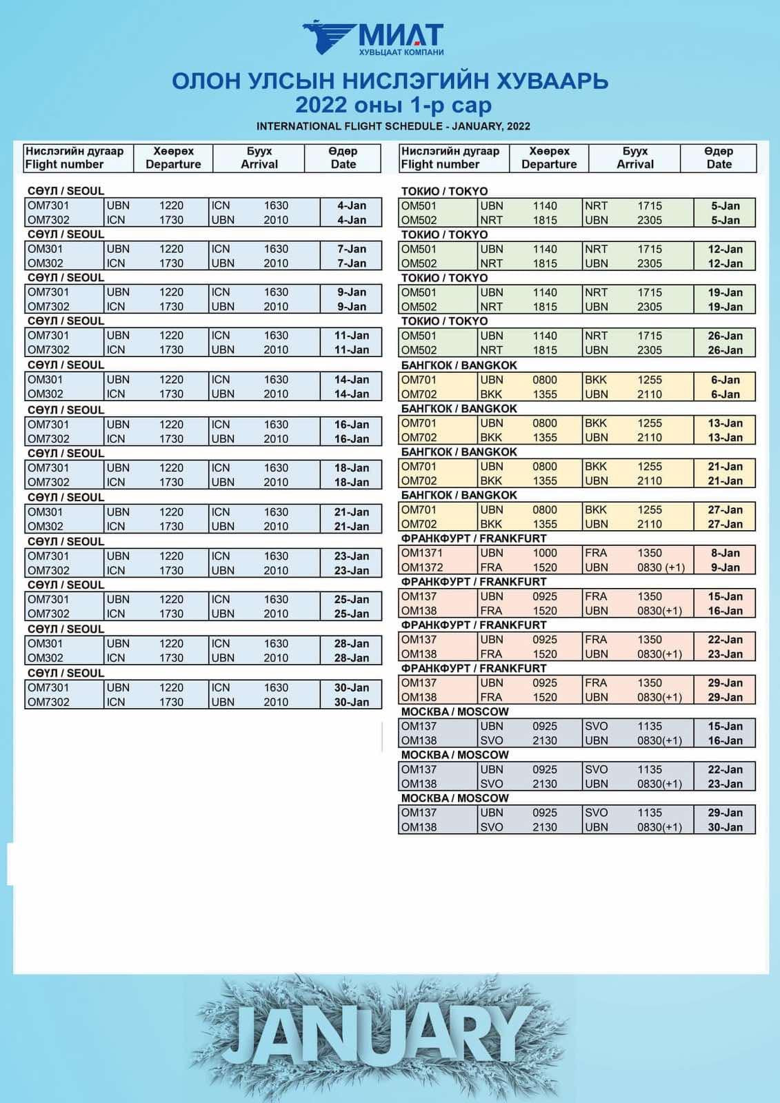 Энэ оны нэг, хоёрдугаар сард хийх олон улсын нислэгийн хуваарийг танилцуулж байна.