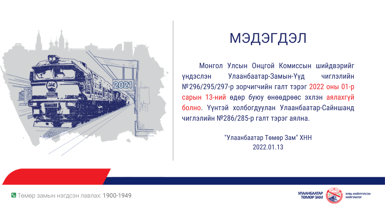 Улсын Онцгой Комиссын шийдвэрийг үндэслэн Улаанбаатар-Замын-Үүд чиглэлийн №296/295/297-р зорчигчийн галт тэрэгний аяллыг өчигдрөөс зогсоолоо. Үүнтэй холбогдуулан Улаанбаатар-Сайншанд чиглэлийн №286/285-р галт тэрэг аялна.