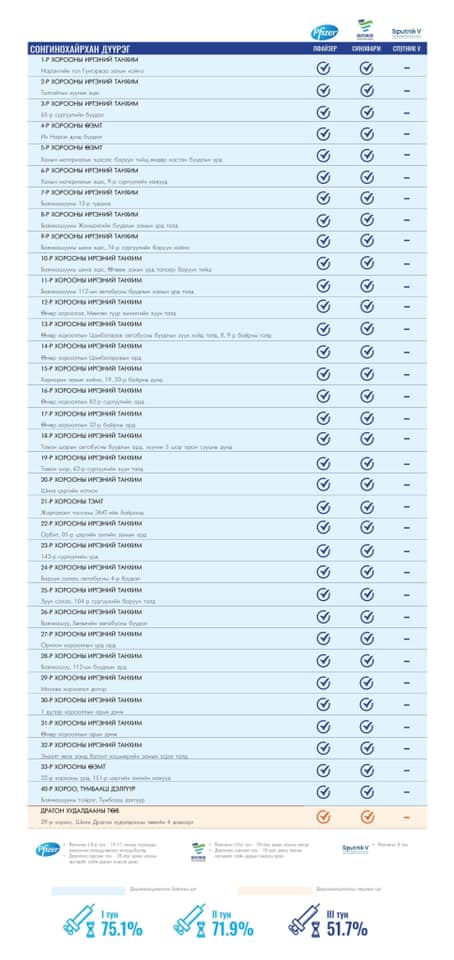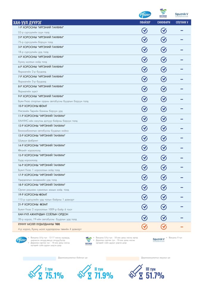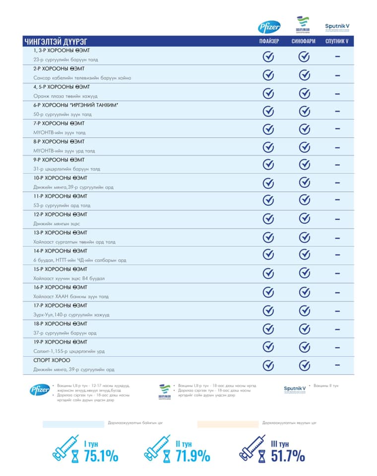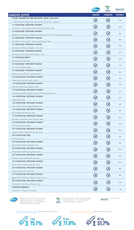 Улаанбаатар хотод өнөөдөр суурин 154, түр гурван цэгт 157 багийн 736 эмч, ажилтан ажиллаж, 6000 иргэнийг дархлаажуулахаар төлөвлөсөн байна. Та өөрт ойр вакцины аль ч цэгт очиж дархлаажуулалтад хамрагдах боломжтой. Дархлаажуулалтын цэгүүд 09:00-18:00 цаг хүртэл ажиллах аж.