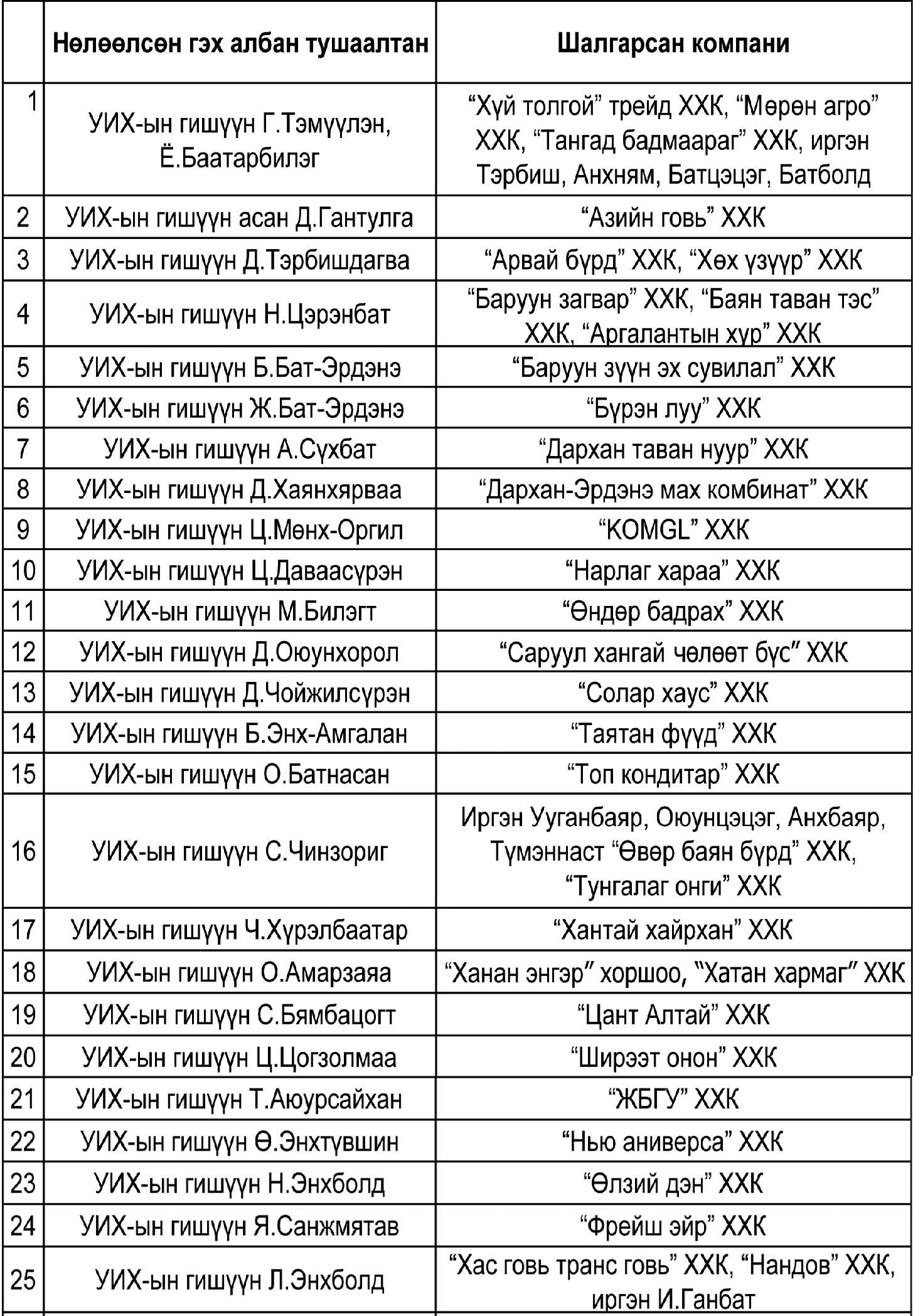 Мөн 2019 оны нэгдүгээр сард Улсын Ерөнхий Прокурорын газраас ЖДҮХС-гаас хууль бусаар зээл авсан гэх үндэслэлээр УИХ-ын дөрвөн гишүүний бүрэн эрхийг түдгэлзүүлэх санал оруулж байв. Тодруулбал, УИХ-ын гишүүн Б.Ундармаа, Г.Солтан, Л.Энхболд, Д.Дамба-Очир нар байлаа. Өнгөрсөн хугацаанд ЖДҮДС-гаас эрх мэдэл, албан тушаалаа урвуулан ашиглаж, их хэмжээний хөнгөлөлттэй зээл авсан гэх албан тушаалтнуудад хариуцлага тооцож байв. Тэгвэл ЖДҮХС-аас 2017,2018 онуудад зээл авсан ч хугацаанаас өмнө буцаан төвлөрүүлсэн зээлдэгчдийн жагсаалтад, Монгол Улсын ерөнхий аудитор асан Д.Хүрэлбаатар, Мэргэжлийн хяналтын Улсын байцаагчаар ажилладаг байсан Ш.Хонгорзул, Барилгын хөгжлийн төв" ТӨҮГ-ын захирал асан Ц.Амарсанаа, МАН-ын Ерөнхий нарийн бичгийн дарга Д.Амарбаясгалан, УИХ-ын гишүүн асан Ж.Энхбаяр, УИХ-ын гишүүн асан О.Батнасан, УИХ-ын гишүүн Б.Саранчимэг, УИХ-ын гишүүн асан Г.Тэмүүлэн, УИХ-ын гишүүн асан А.Сүхбат нар хугацаанаасаа өмнө зээлээ эргүүлэн төлж байжээ.