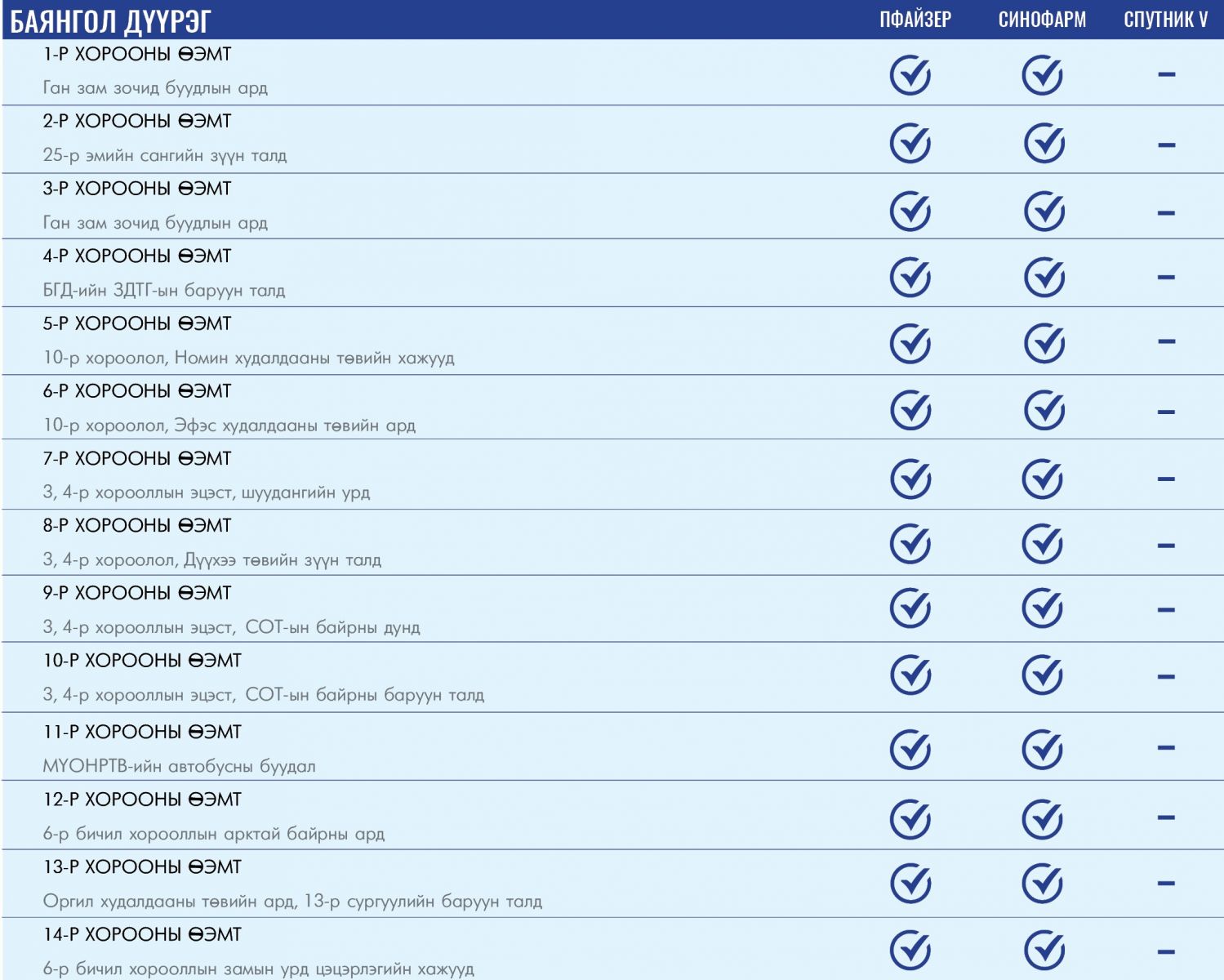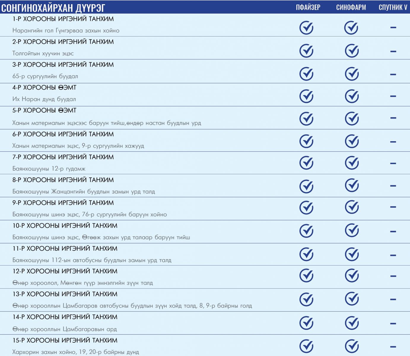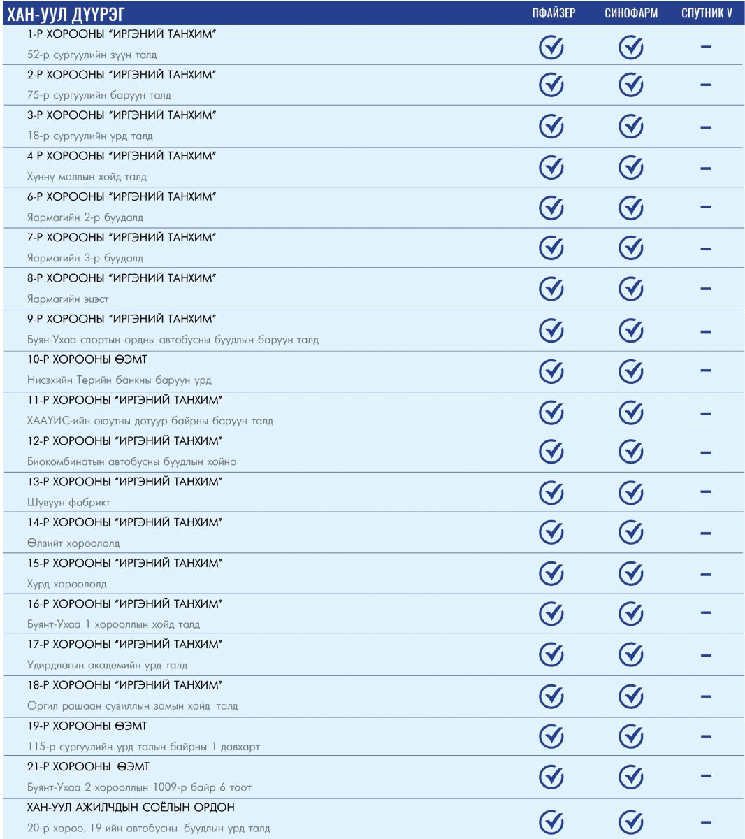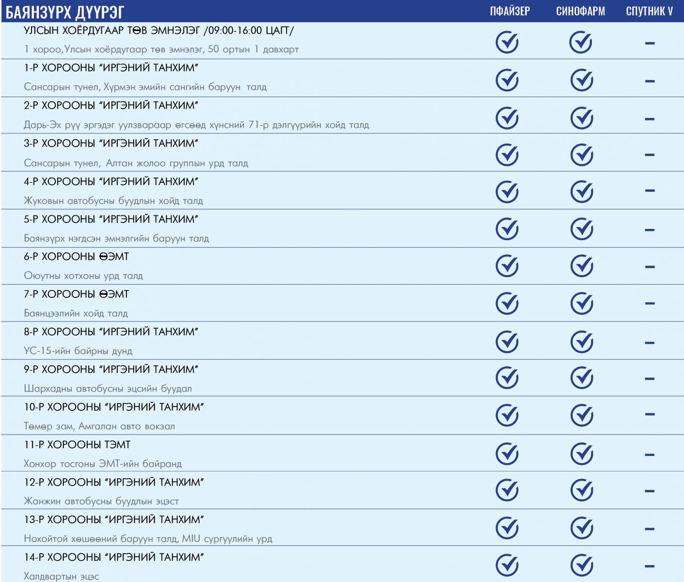 Өнөөдөр ажиллах дархлаажуулалтын цэгийг дүүрэг тус бүрээр нь танилцуулж байна.