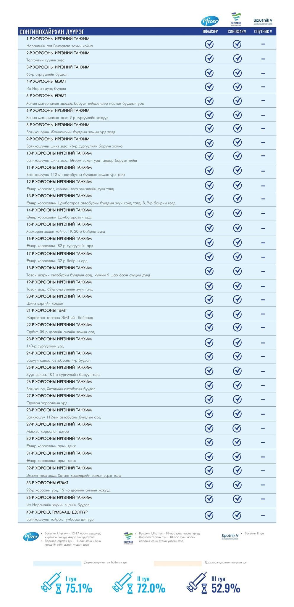 Өнөөдөр буюу хоёрдугаар сарын 18-нд ажиллах дархлаажуулалтын суурин 157 цэгт 157 багийн 749 эмч, ажилтан ажиллана. Та өөрт ойр вакцины аль ч цэгт очиж дархлаажуулалтад хамрагдах боломжтой.