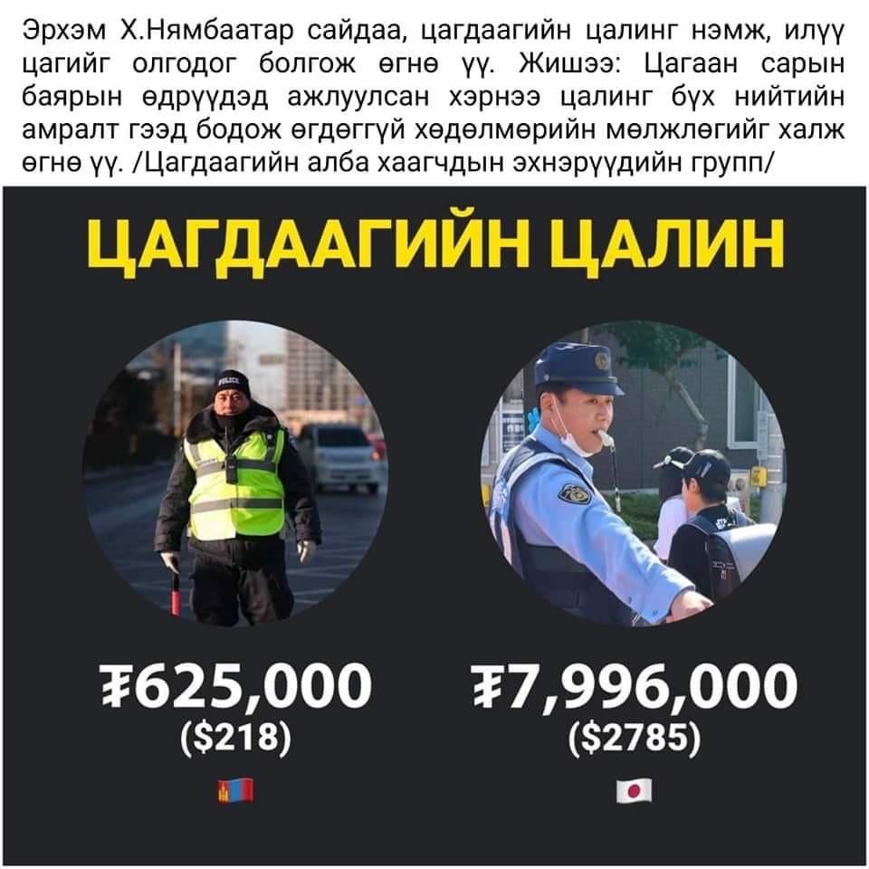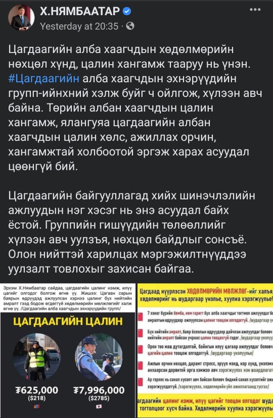 Цагдаагийн алба хаагчдын эхнэрүүдийн группээс нөхрүүдийнхээ цалинг бусад улсын цагдаагийн цалинтай харьцуулж, олон нийтийн сүлжээнд байршуулсан билээ. Харин Х.Нямбаатар сайд өөрийн цахим хуудастаа “Цагдаагийн алба хаагчдын хөдөлмөрийн нөхцөл хүнд, цалин хангамж тааруу нь үнэн. Цагдаагийн алба хаагчдын эхнэрүүдийн группийнхний хэлж буйг ч ойлгож, хүлээн авч байна. Төрийн албан хаагчдын цалин хангамж, ялангуяа цагдаагийн албан хаагчдын цалин хөлс, ажиллах орчин, хангамжтай холбоотой эргэж харах асуудал цөөнгүй бий.