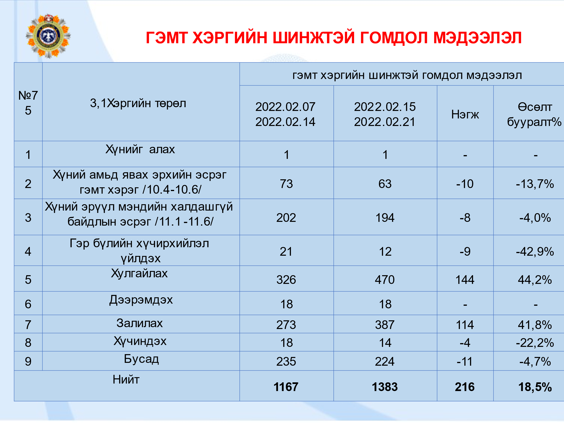 Тэгвэл худалдаа, үйлчилгээний зарим байгууллагын ажиллах цагийн хуваарьт өөрчлөлт оруулсан тус захирамж хэрэгжиж эхэлснээс хойш согтууруулах ундаа хэрэглэсэн үед үйлдэгддэг гэмт хэрэг, зөрчлийн тоо буурчээ. Тодруулбал, Нийслэлийн Засаг даргын захирамж гарахаас өмнөх буюу 2022 оны хоёрдугаар сарын 7-14-ний хоорондох архидан согтуурч гэмт хэрэг, зөрчилд өртөж хохирох, холбогдох дуудлага, мэдээллийг хоёрдугаар сарын 15-21-ний хоорондохтой харьцуулахад 129 нэгж буюу 4.6 хувиар буурсан байна. Гэмт хэргийн шинжтэй гомдол мэдээллийг дотор нь ангилаад үзвэл, хүний амьд явах эрхийн эсрэг гэмт хэрэг 13.7, хүний эрүүл мэндийн халдашгүй байдлын эсрэг гэмт хэрэг дөрвөн хувь, гэр бүлийн хүчирхийлэл 42.9, хүчиндэх гэмт хэрэг 22.2 хувиар тус тус буурчээ.