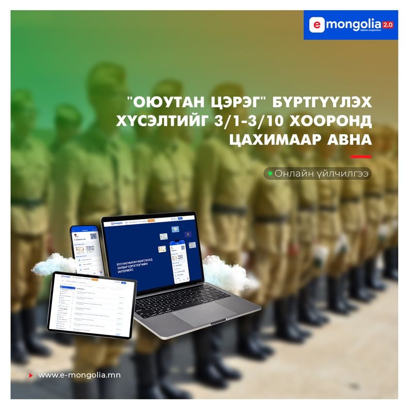 “Оюутан цэрэг”-ийн бүртгэл маргааш буюу гуравдугаар сарын 1-нд эхэлнэ. Бүртгэлийг гуравдугаар сарын 10-н хүртэл "Е-Mongolia" платформоор бүртгэх юм. Тус сургалтад бүртгүүлэхэд тавигдах шаардлага нь