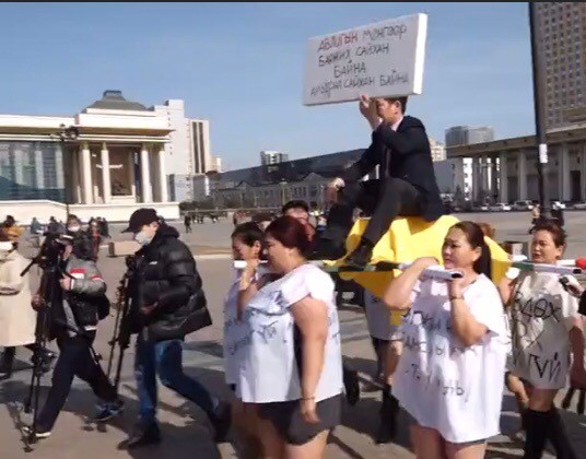 Энэ үеэр жагсагч "Монголын худалдаачдын холбоо төрийн бус байгууллагаас худалдаа эрхлэгч ээжүүдийнхээ эрх ашгийг хамгаалж, өнөөдөр хагас нүцгэн жагсаалыг зохион байгуулж байна. Хөгжлийн банк, ЖДҮ, арван их наяд гээд бүгдээрээ бага хувийн хүүтэй зээл аваад байна. Гэтэл бүгдээрээ банк бусаар дамжуулан мөнгө хүүлээд байна. Үйлчилгээний салбар болон худалдаа эрхлэгчид бүгд жилд 160-360 хувийн хүүтэй зээлэнд дарлуулж байна. Өнөөдөр талбай дээр бид хүнд зүйл өргөж явж байгаа шигээ амьдарч байна. Худалдаа үйлчилгээний салбарынхныг төр 32 жил хаячихсан байна. Бидэнд хууль хэрэгтэй байна, худалдаачдыг дэмжих сан хэрэгтэй байна, биднийг өнөөдөр эрхзүйн орчинг бүрдүүлж өгөөгүй байж яагаад төр дарамтлаад байдаг юм. Төр өнөөдөр авахаа мэддэг татвар, түрээс гээд авна. Өнөөдөр бид мөнгөний машин болсон байна" гэв.
