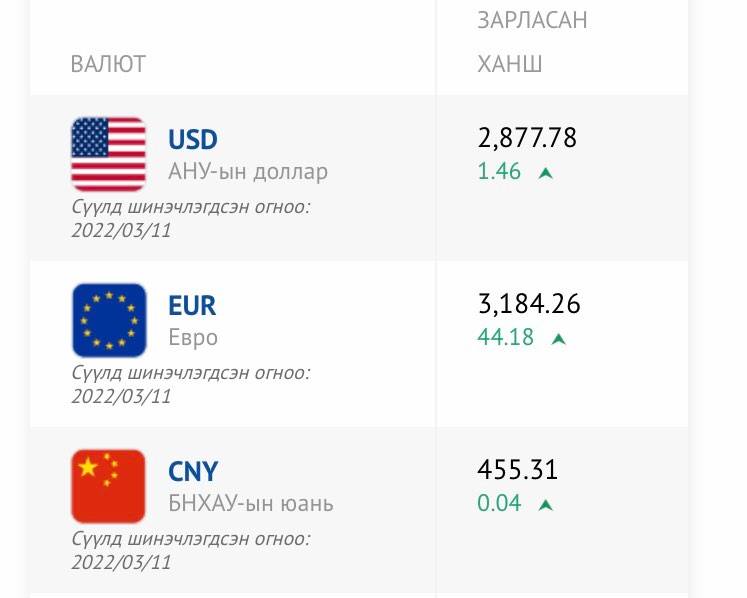 Ам.доллар, валютын үнэ ханш сүүлийн жилүүдэд өсөөд буй. Тэр дундаа хичээл, сургууль орох үеэр ам.долларын үнэ ханш илүүтэй өсдөг. Энэ ч утгаар гуравдугаар сарын байдлаар долларын үнэ мөн өссөн үзүүлэлттэй байна. Тухайлбал, Монгол банкнаас гуравдугаар сарын 11-ны байдлаар зарласан валютын ханшаар ам.доллар 2878 төгрөг, евро 3184, юань 455.31 төгрөгийн үнэтэй байна. Харин голомт банкнаас гаргасан валютын ханшаар ам.доллар авах нь 2878, зарах нь 2893, евро авах нь 3126, зарах нь 3276, юань авах нь 452.50, зарах нь 463.708 төгрөгийн үнэтэй байна. Мөн Худалдаа хөгжлийн банкнаас гаргасан валютын ханшаар ам.доллар авах нь 2879, зарах нь 2893, евро авах нь 3132, зарах нь 3233.00 төгрөгийн үнэтэй байгаа бол юань авах нь 453.00, зарах нь 460.30 төгрөгийн үнэтэй байна. Харин “Найман шарга” захын хувьд ам долларын үнэ ханш ам.доллар 2870 төгрөг, евро 3255 төгрөг, юань 453.0 төгрөгөөр худалдаалж байна.