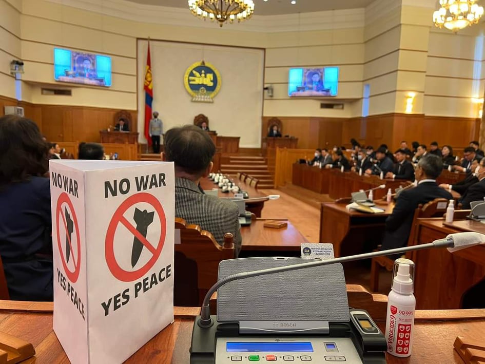 | УИХ-ын гишүүн Г. Дамдинням “No war, Yes peace” хэмээх лоозон барьж, чуулганы нээлтэд оролцжээ |