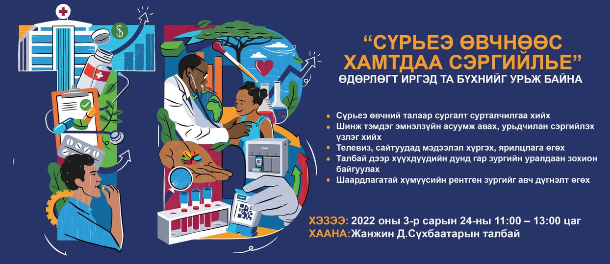 Дэлхийн эрүүл мэндийн байгууллагаас жил бүрийн гуравдугаар сарын 24-нийг “Сүрьеэтэй тэмцэх дэлхийн өдөр" болгон зарласан. 2022 онд тус өдрийг “Сүрьеэгүй ирээдүйн төлөө хөрөнгө оруулалтыг нэмэгдүүлье” уриан дор тэмдэглэн өнгөрүүлэх гэж байна. Энэ хүрээнд ХӨСҮТ, НЗДТГ, НЭМГ, НЭМҮТ, дүүргийн эрүүл мэндийн төвийн сүрьеэгийн диспансерийн хамт олон болон төрийн бус байгууллагууд хамтран маргааш Сүхбаатарын талбайд нээлттэй өдөрлөгийг 11:00-13:00 цагийн хооронд зохион байгуулна. Энэ үеэр сүрьеэ өвчний талаар сургалт, сурталчилгаа хийхээс гадна эмнэл зүйн асуумж авч, урьдчилан сэргийлэх үзлэг хийж, шаардлагатай хүмүүсийн рентген зургийг авах юм. Мөн хүүхдүүдийн дунд гар зургийн уралдаан зохион байгуулна.