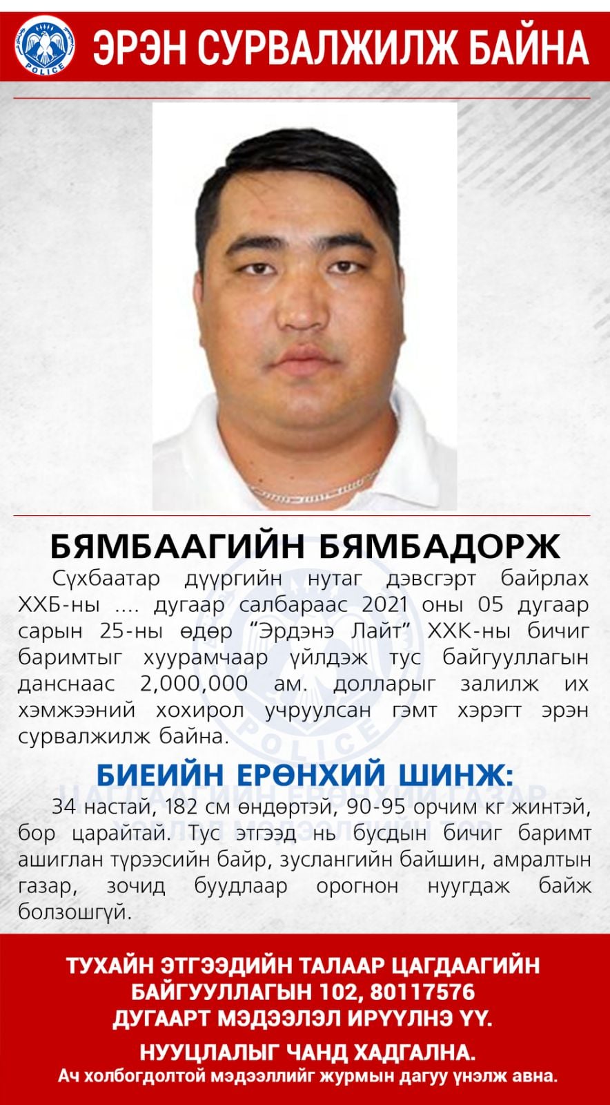 Худалдаа хөгжлийн банкны Сүхбаатар дүүрэг дэх салбараас 2021 оны тавдугаар сарын 25-нд “Эрдэнэт Лайт” ХХК-ын бичиг баримтыг хуурамчаар үйлдсэн хэрэг гарчээ. Тодруулбал, тус байгууллагын данснаас хоёр сая ам.долларыг залилж, их хэмжээний хохирол учруулсан гэмт хэрэгт Б.Бямбадорж гэх 34 настай эрэгтэйг эрэн сурвалжил байгаа аж. Тухайн этгээдийг харсан болон таньдаг хүн байвал 102, 80117576 дугаар утсанд хандахыг анхааруулж байна.Худалдаа хөгжлийн банкнаас хоёр сая ам. доллар залилсан гэх Б.Бямбадоржийг эрэн сурвалжилж байна.