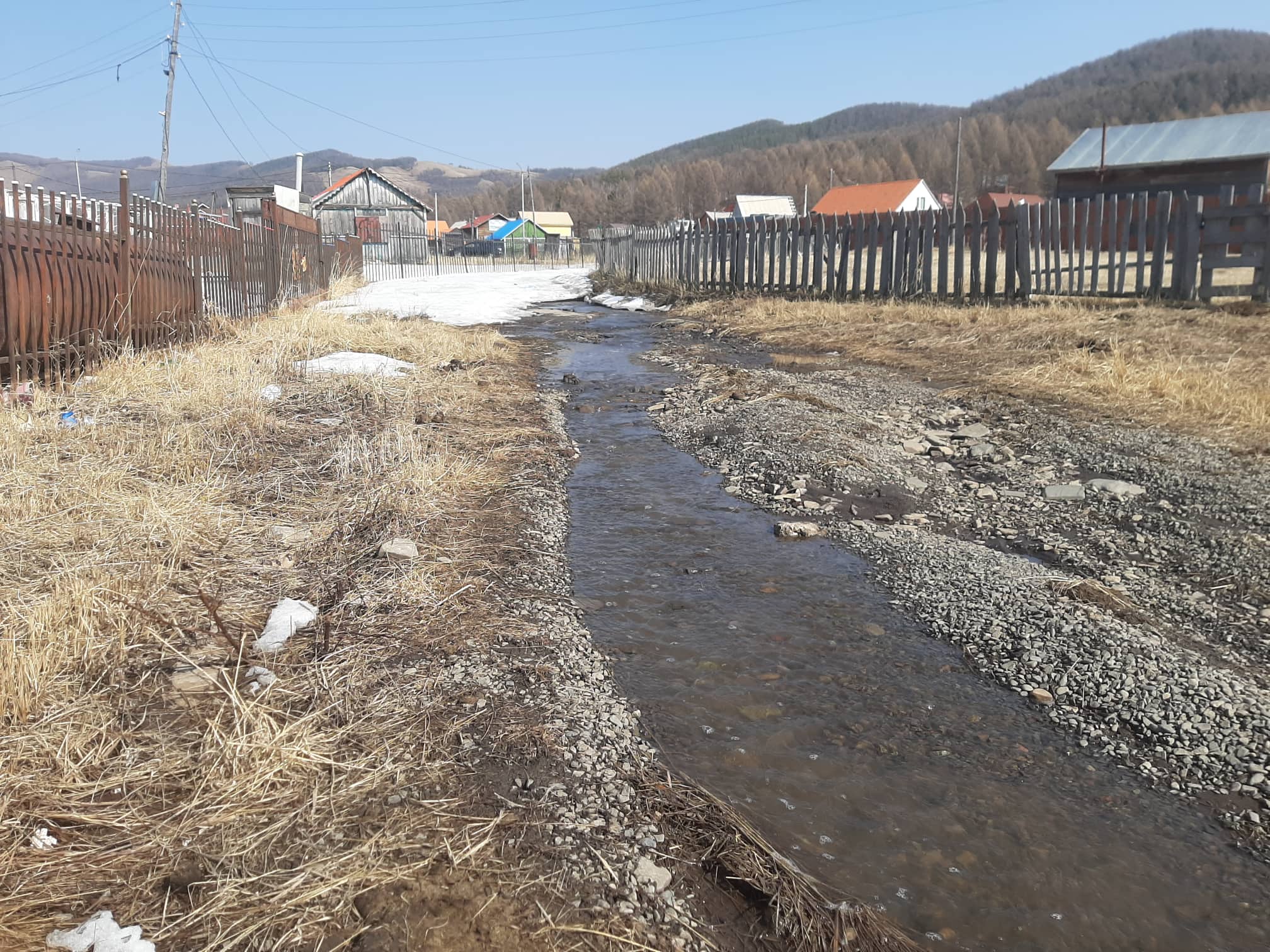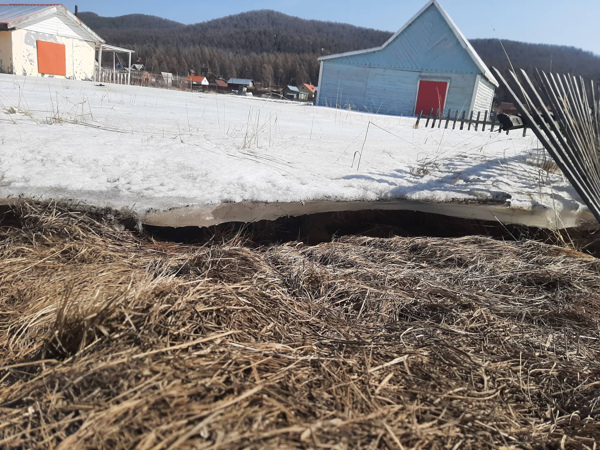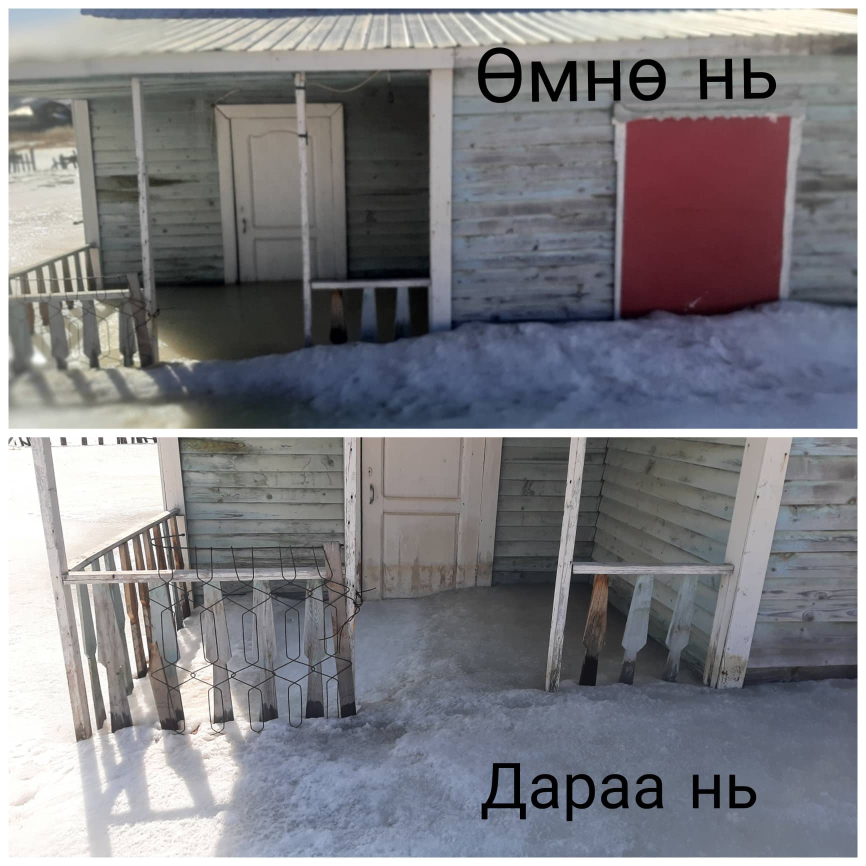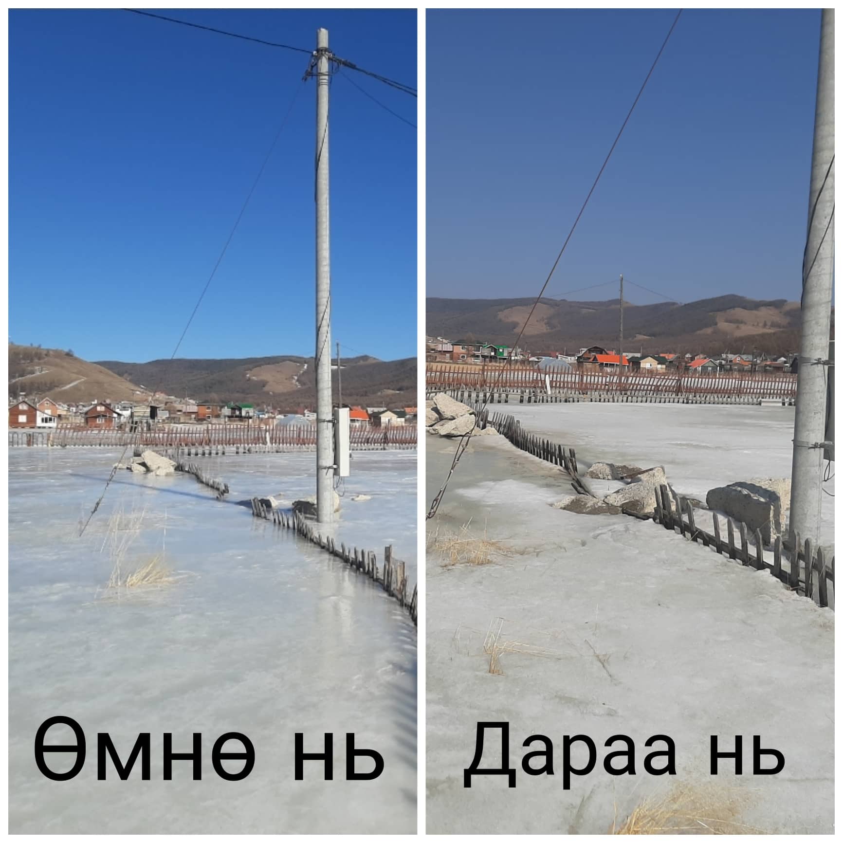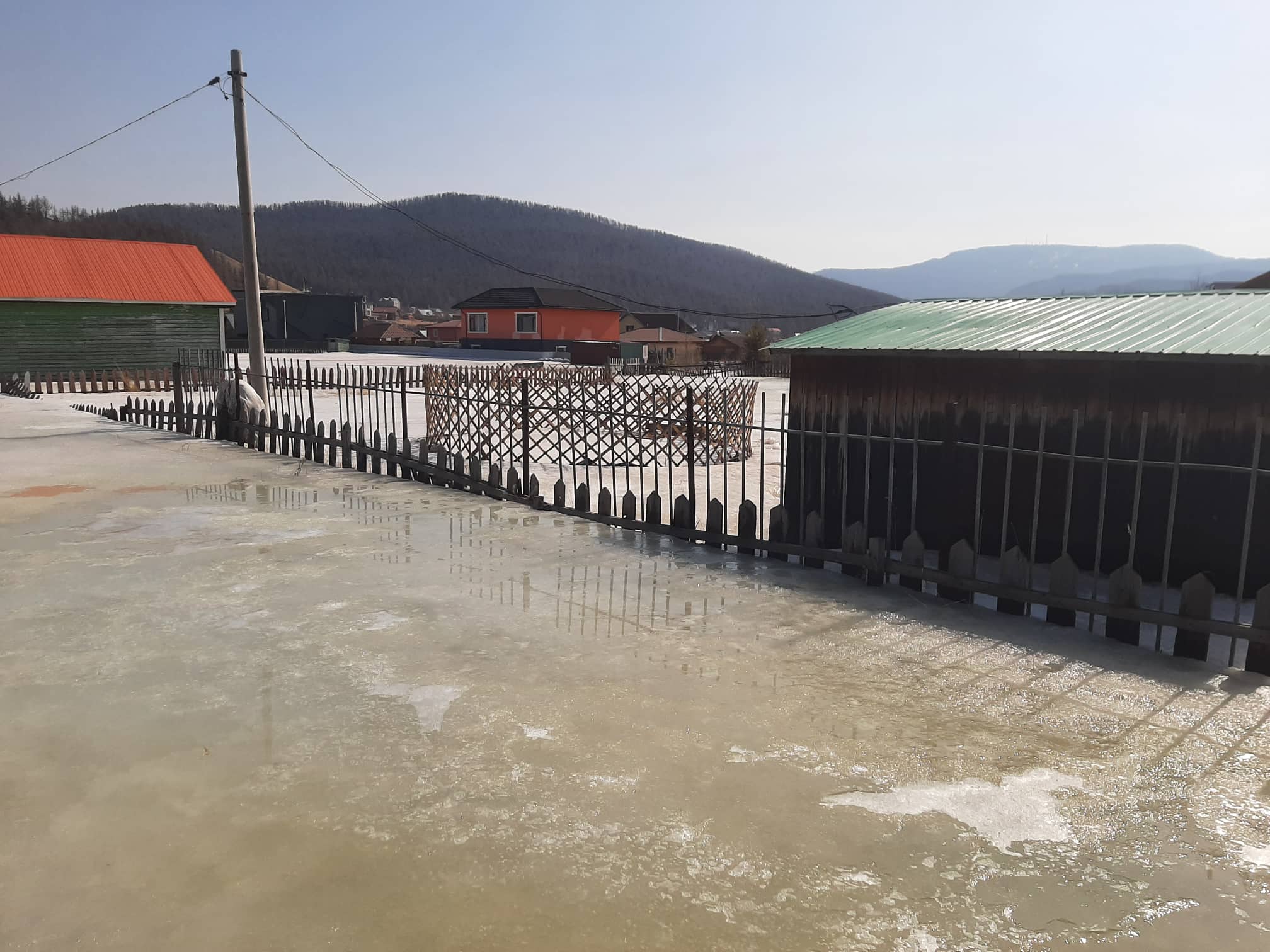 Цаг агаар дулаасныг ашиглан засвар хийж байгаа айлуудын алх хадаасны харшилдах дуу, хашаандаа хөөцөлдөн тоглох хүүхдүүдийн инээдээр аниргүй зуслан “амь” оржээ. Харин гүн хөлдүүс байгаа газар руу ойртох тусам чимээгүй болсоор байв. Энэ нь хөлдүүсэн дунд орхигдсон байшингийн эзэд гэртээ ирээгүй гэдгийг илтгэж байлаа. Иргэдийн тэгш талбайг нь харж зуслангийн байшингаа барьсан энэ газарт булгийн халиа ундарч хашаа давах хэмжээний өндөртэй мөсийг үүсгэдэг. Мөсөн дээр алхах үед хатуу гадаргуу бус хайлж буй цасан дээр алхаж байгаа мэт мэдрэгдэнэ. Улаан тоосгон байшингийн цонх хүртэл өндөр мөсөн бүрхүүлийн гадарга хэсэг хайлж цонхны тавцан дээр хайлсан ус нь гялтганан харагдана.Мөс хайлж цахилгаан шонгийн хажууд байсан овоолоостой чулуу ил гарч эхэлжээ. Өвлийн улирал хүүхдүүдийн тоглодог болсон энэ мөсөн хөлдүүс хайлж, одоо зарим хэсэгтээ эвгүй гишгэхэд доошоо цөмрөхөөр болсон байлаа. Харин тогтоол усны доор зузаан мөс байгаа хэвээр ажээ. Төмөр сараалжин хашааны үзүүр хэсэг нь харагддаг хэвээр байлаа. Энэ гүн хөлдүүс бүрэн хайлж дуустал хэчнээн удахыг илтгэж байсан юм. Харин энд хазайсан байсан цахилгааны шон хөдөлгөөнийг нь хорьсон мөс хайлснаар улам хазайсан ажээ. Цахилгааны шонгоос хөлдүүс дунд байгаа байшин руу татсан цахилгааны утас гэрлийн шон унахад татагдан тасрахаар харагдана.