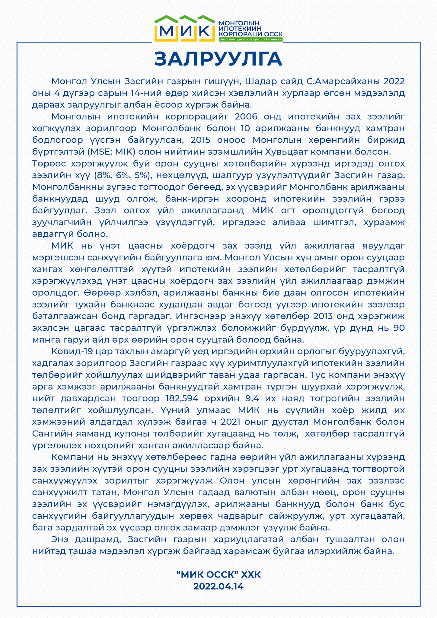 Монголын ипотекийн корпорац зээл авсан иргэдэд зуучилсан нэрийдлээр хувь авч, луйварддаг тухай Шадар сайдын дээрх мэдээллийг үгүйсгэж, иргэдэд буруу ташаа мэдээлэл өгч болохгүй хэмээн МИК-ээс залруулга гаргасан. Тухайлбал, Монголын ипотекийн корпорац “Төрөөс хэрэгжүүлж буй орон сууцны хөтөлбөрийн хүрээнд иргэдэд олгох зээлийн хүүгийн шалгуур үзүүлэлтүүдийг Засгийн газар, Монгол банкнаас тогтоодог бөгөөд, эх үүсвэрийг Монголбанк арилжааны банкнуудад шууд олгож, банк-иргэний хооронд ипотекийн зээлийн гэрээ байгуулдаг. Зээл олгох үйл ажиллагаанд МИК огт оролцдоггүй бөгөөд зуучлагчийн үйлчилгээ үзүүлдэггүй, иргэдээс аливаа шимтгэл, хураамж авдаггүй” хэмээсэн байдаг.
