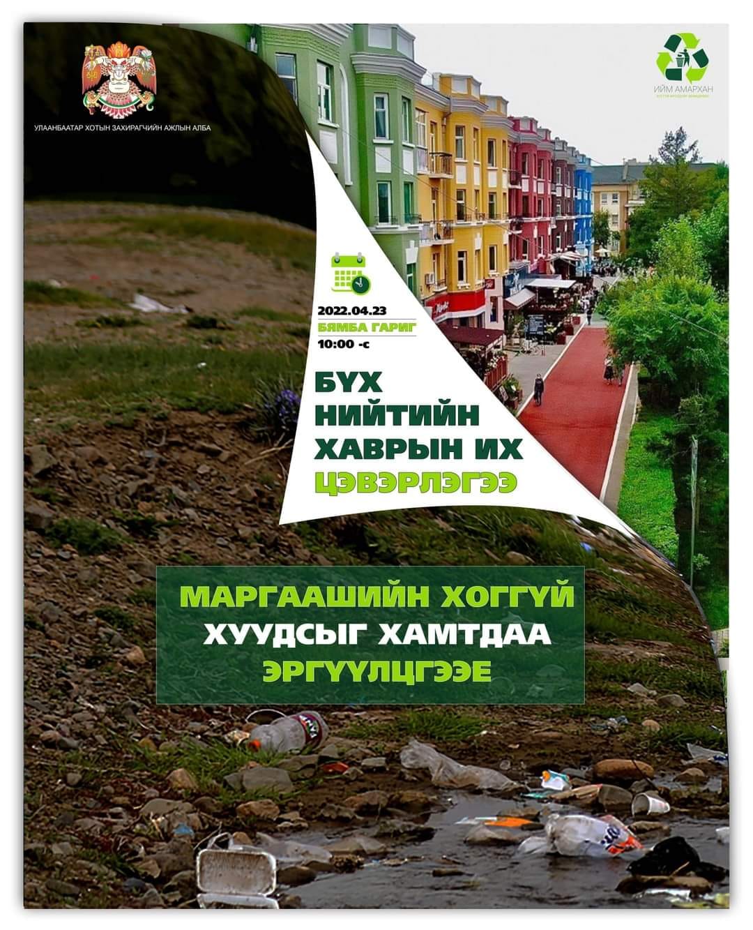 Иймд бүх дүүргийн ЗДТГ, харьяа шатны байгууллагууд, хороод, аж ахуйн нэгж, байгууллагууд, их, дээд сургууль, ерөнхий боловсролын сургууль, цэцэрлэгүүдийг өргөнөөр оролцож, гадна орчныхоо 50 метр хүртэлх зам, талбай, орчныхоо хог хаягдлыг цэвэрлэх, барилгын хана, үүд, цонх, хаяг, самбар, гадна талбайг угааж цэвэрлэн, цэвэр цэмцгэр орчныг бүрдүүлэхийг уриалж байна.