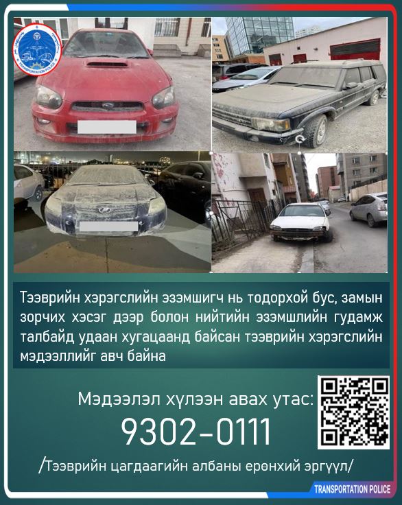 Иргэн та өөрийн эзэмшилд байгаа ашиглах боломжгүй болсон тээврийн хэрэгслийн улсын дугаарыг хураалган бүртгэлээс хасуулах үүрэгтэй байдаг тул Автотээврийн үндэсний төвд хандахыг зөвлөж байна гэж Тээврийн цагдаагийн албанаас мэдээллээ.