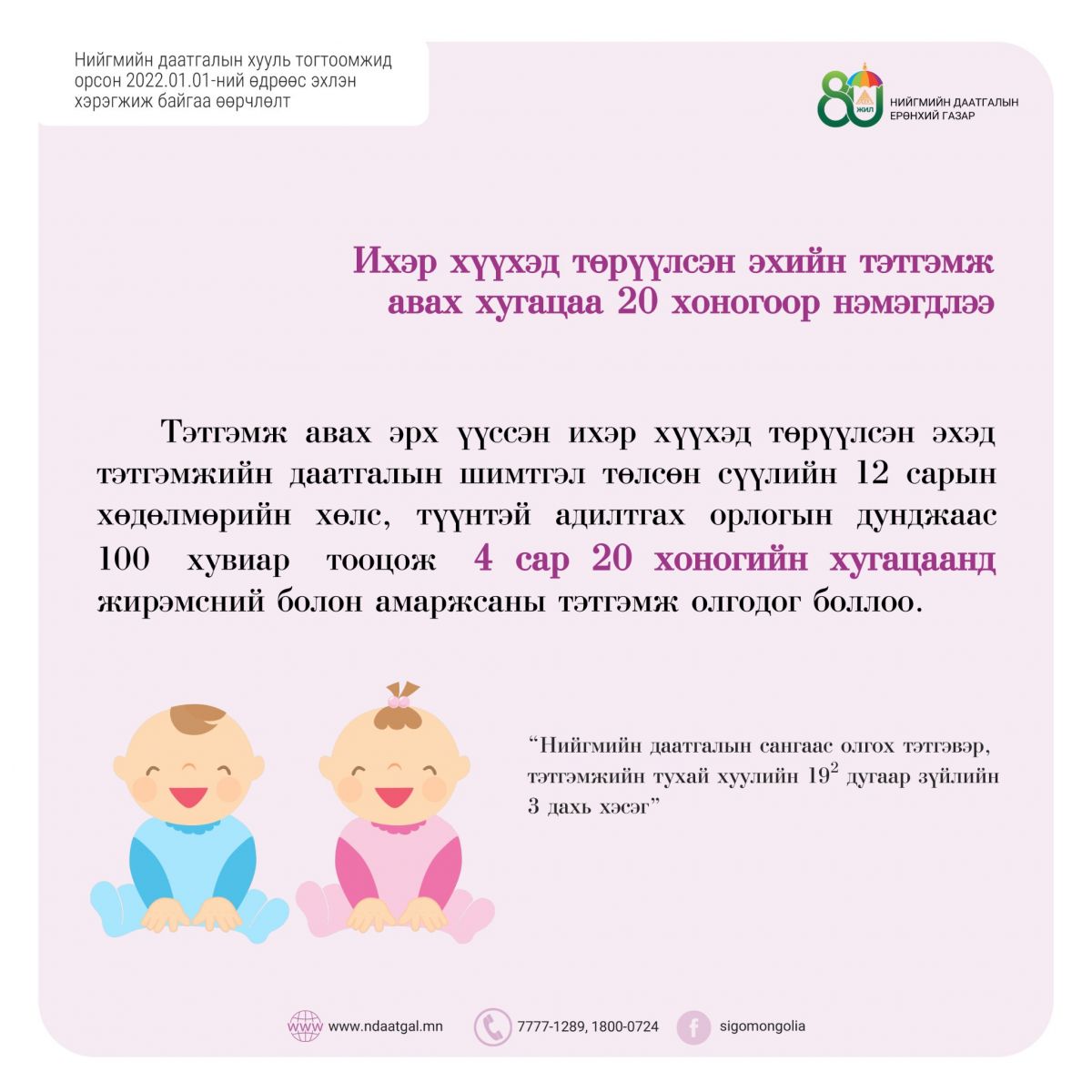 | Ихэр хүүхэд төрүүлсэн эхийн тэтгэмж авах хугацаа 20 хоногоор нэмэгдлээ |