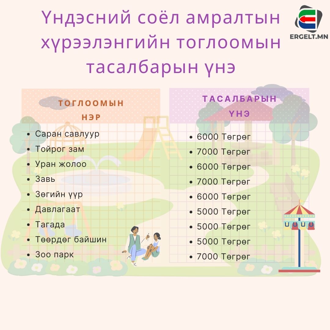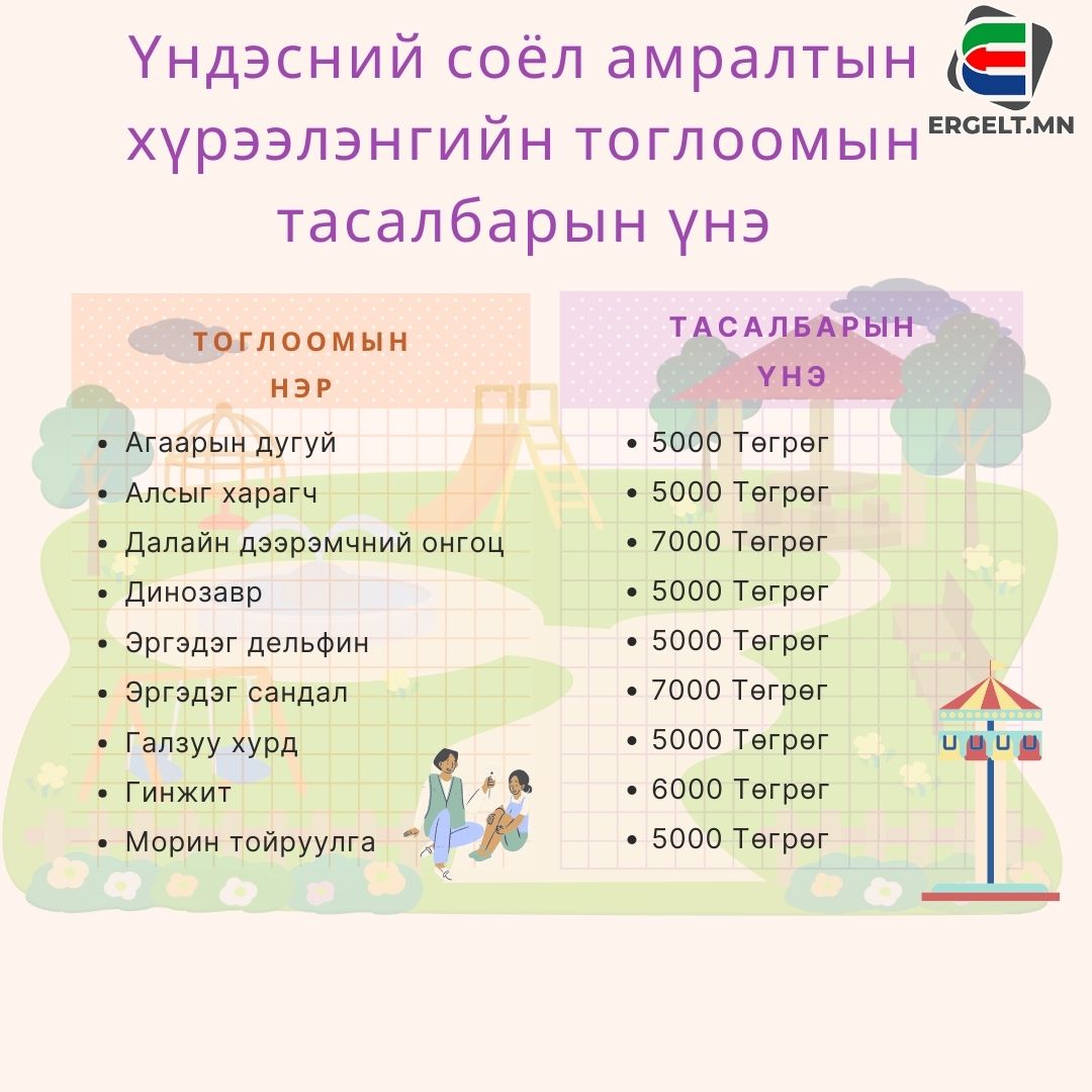 | Үндэсний соёл амралтын хүрээлэнгийн тоглоомын тасалбарын үнэ |