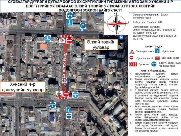 | Хүнсний 4-р дэлгүүрийн уулзвараас Өлзий төв хүртэлх автозамын хөдөлгөөнийг хязгаарлалаа |