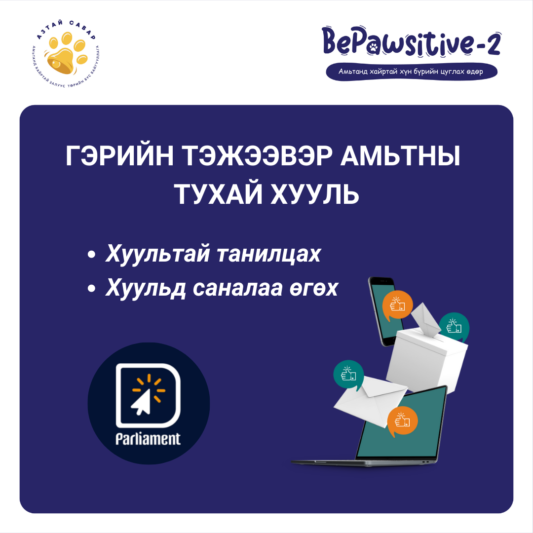 Гэрийн тэжээвэр амьтны тухай хууль монгол улсад зайлшгүй хэрэгцээтэй байгаа. Та бүхэн BePawsitive-2 өдөрлөгт ирснээр "Гэрийн Тэжээвэр Амьтны Тухай Хууль"-тай болоход хувь нэмрээ оруулах боломжтой юм. Мөн гадаа талбайд хайртай гэрийн тэжээвэр амьтадтайгаа өдрийг зугаатай өнгөрүүлэх булангууд болон хөгжөөнт тэмцээнүүд зохион байгуулагдана.