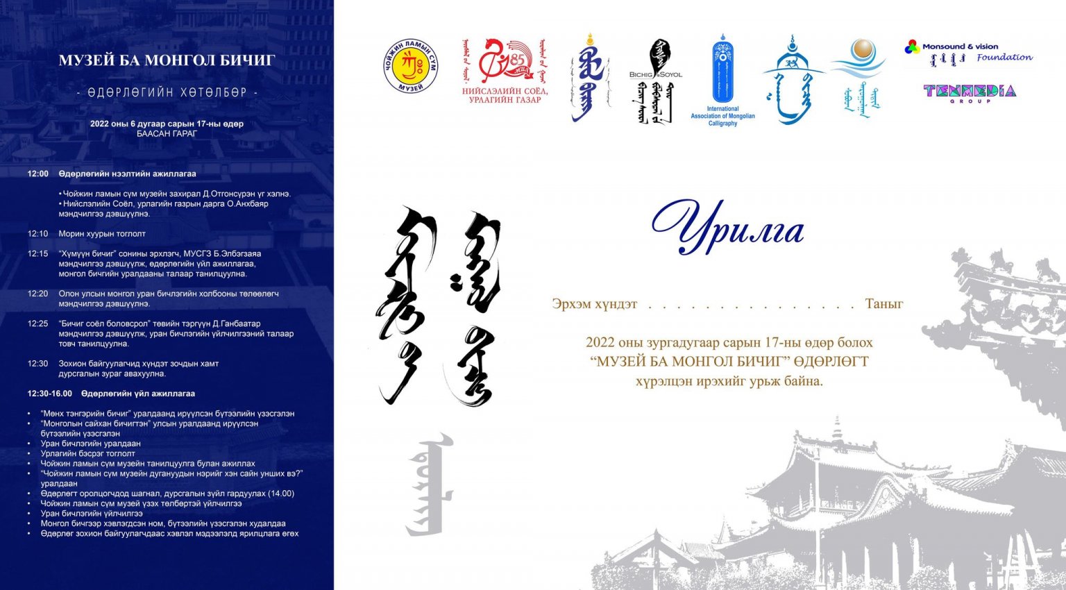 Чойжин ламын сүм музейгээс санаачлан 1000 илүү жилийн түүхтэй, үндэсний сонгодог Монгол бичгээ нийтээр сэргээн хэрэглэх, хойч үедээ өвлүүлэх, монгол хүн бүрийн эх хэл, бичиг үсэг, түүх соёлын мэдлэгээ гүнзгийрүүлэн, өв соёлоо хайрлан хамгаалахад нь чиглэсэн аливаа санаачилга, үйл хэргийг дэмжин өөгшүүлэх , монгол бичгээр үйлдсэн үнэлж баршгүй арвин их өвийг дотоод, гадаадад сурталчлах 2025 оноос хос бичигтэн болох тухай Монгол Улсын хуулийг хэрэгжүүлэх үйлсэд хувь нэмэр оруулах зорилгоор “МУЗЕЙ БА МОНГОЛ БИЧИГ” өдөрлөгийг зохион байгуулж байна.