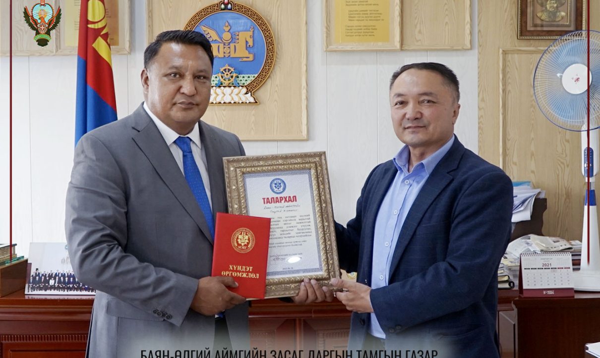 | Мал эмнэлгийн ерөнхий газраас Баян-өлгий аймгийн Засаг даргыг “Хүндэт өргөмжлөл”-өөр шагналаа |