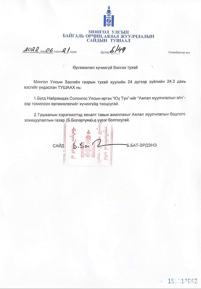 Аялал, жуулчлалын сайд Б.Бат-Эрдэнэ БНСУ-ын иргэн ЮүТүнд Солонгосоос Монголд аялсан анхны аялагч жүжигчин хэмээн өргөмжлөл олгож, дөрөв хоногийн дараа цуцалжээ. Б.Бат-Эрдэнэ сайдын дээрх ажлыг олон шүүмжилж байгаа бөгөөд тэрбээр “ БНСУ-ын жүжигчин ЮүТүн-ийг Монгол Улсад хамгийн олон удаа аялсан гэх судалгаа гарсан учир түүнд өргөмжлөл олгосон. Харин өргөмжлөл олгосны дараа түүнийг монгол эмэгтэйчүүдтэй олон удаа гэр бүл болж, салж байсан гэх мэдээлэл ирсэн учир түүнд олгосон өргөмжлөлийг цуцалсан. Сайдын зүгээс томилсон тушаал гаргаагүй зөвхөн өргөмжлөл олгосон” гэж цахим хуудастаа нийтэлжээ.
