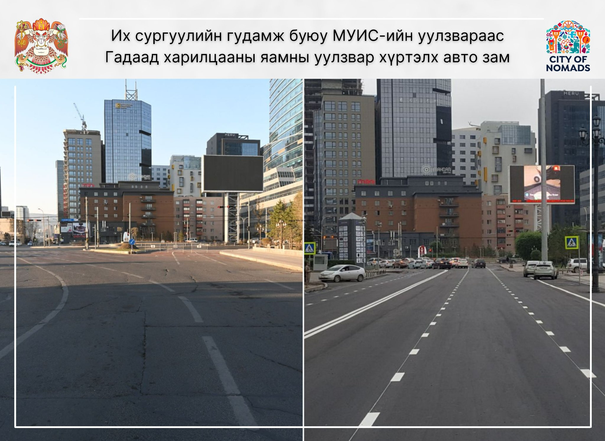 Их сургуулийн гудамжны авто замын засвар, шинэчлэлийн хүрээнд МУИС-ийн уулзвараас Гадаад харилцааны яамны уулзвар хүртэлх авто замд цемент бетон хучилтын хэв гажилтын заадас засварлах, асфальт бетон хучилт, хэвтээ тэмдэглэл хийх ажлыг гүйцэтгэж дууслаа. Одоогоор явган хүний зам засах ажил үргэлжилж байна. Уг хэсгийн засвар, шинэчлэлийн ажил долдугаар сарын 8 гэхэд бүрэн дуусна.