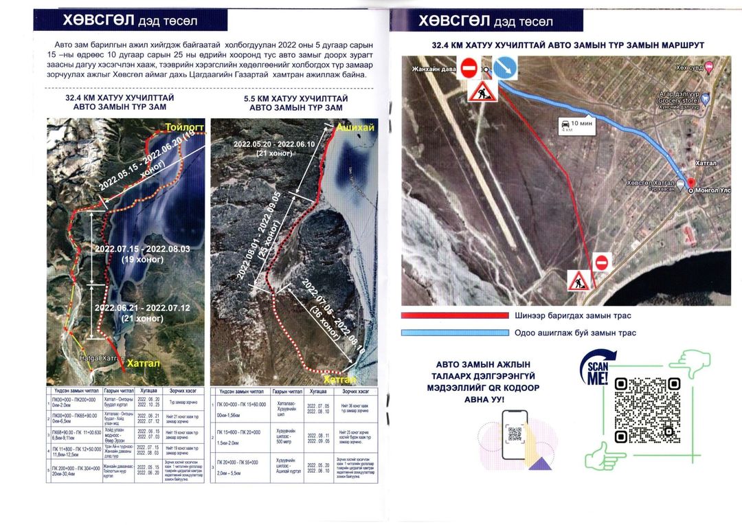 БОАЖЯ-ны харьяа Азийн хөгжлийн банкны санхүүжилтээр хэрэгжиж буй “Тогтвортой аялал жуулчлалыг хөгжүүлэх” төслийн хүрээнд Хөвсгөл нуурын байгалийн цогцолборт газрын гурван чиглэлд нийт 37.9 км хатуу хучилттай авто замын барилгын ажил хийгдэж байгаатай холбогдуулан Хатгал-Жанхай-Тойлогт чиглэлийн 30.4 км автозам дагуу гурван байршлыг, Хатгал-Хүзүүвчийн шил-Ашихай чиглэлийн 5.5 км автозам дагуу хоёр байршлыг тус тус хаасан бөгөөд хаагдсан хэсэг тус бүрд түр зам гарган ажиллаж байна.