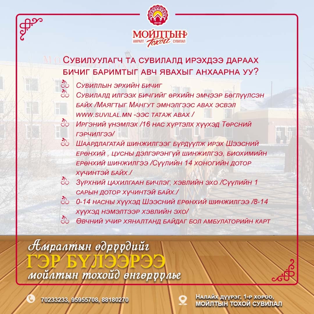 Холбоо барих: 7000-3034, 9582-9918, 9636-3032