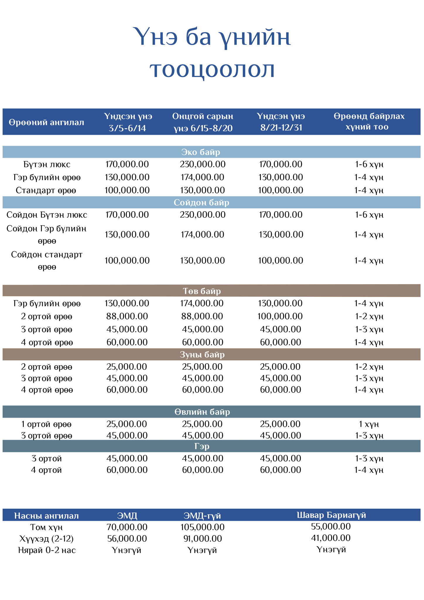 Тус сувилалд мэргэжлийн эмч, сувилагч нар зүүн эмчилгээ, сэргээн засах эмчилгээ, бумба, шавар эмчилгээ, бариа засал гээд олон төрлийн уламжлалт анагаах ухааны эмчилгээг хийдэг.Сувилалд ЭМД ашиглан хөнгөлөлт авах боломжтой.Сувилалд 4,5 ортой энгийн өрөө нь өдрийн 77000, 4,5 ортой дүнзэн байшин 77000 ,хагас люкс буюу 1,2 ортой өрөө нь өдрийн 90000, бүтэн люкс 1,2,3 ортой өрөө нь өдрийн 122000 төгрөгний үнэтэй.