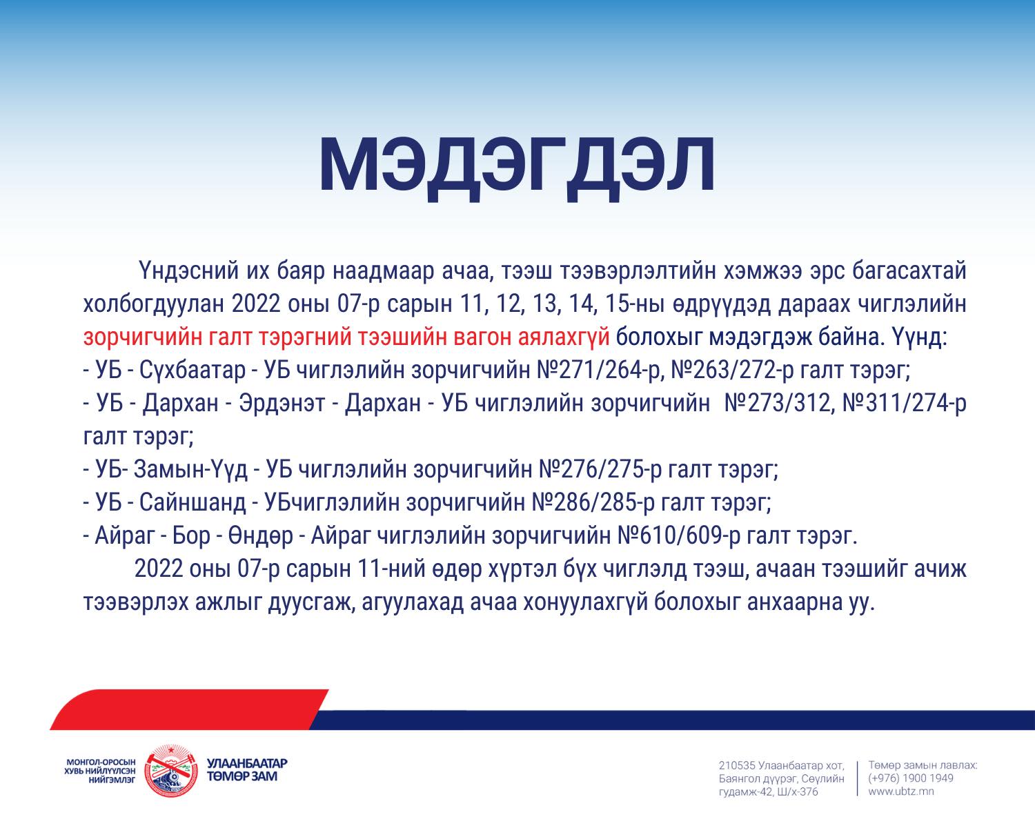 Үндэсний их баяр наадмаар ачаа, тээш тээвэрлэлтийн хэмжээ эрс багасахтай холбогдуулан 2022 оны долдугаар сарын 11-15-ны өдрүүдэд дараах чиглэлийн зорчигчийн галт тэрэгний тээшийн вагон аялахгүй болохыг мэдэгдэж байна.