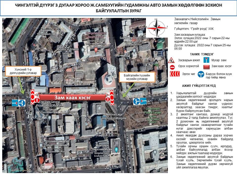 Харин хоёр дахь хэсгийн замын зорчих хэсгийг маргаашаас хааж, хучилт хийх гэж байна. Тодруулбал, долдугаар сарын 22-ны 22:00 цагаас долоодугаар сарын 25-ны 06:00 цагийн хооронд Хүнсний 1-р дэлгүүрийн уулзвараас Байгалийн түүхийн музейн зүүн урд талын уулзвар хүртэл замын хөдөлгөөнийг хязгаарлах юм. Энэ хугацаанд зорчих хэсгийн тэгшилгээний үе болон инженерийн шугам сүлжээний худгийн тагийн түвшинг тааруулах, асфальт бетон хучилт хийх зэрэг ажлыг гүйцэтгэнэ.