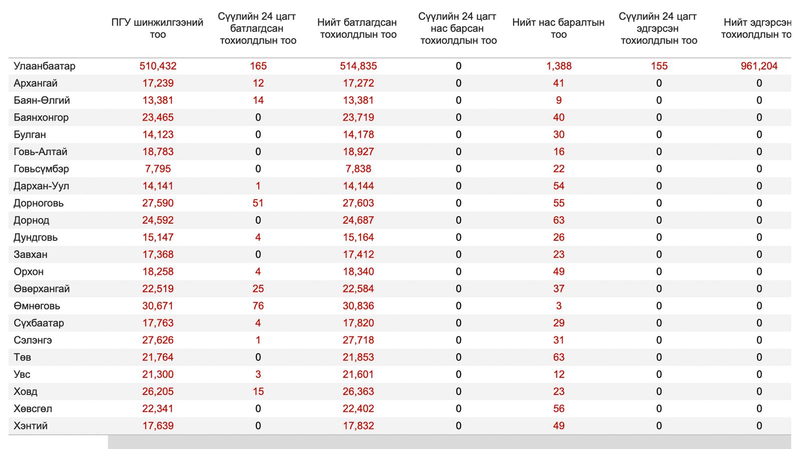 Үүнээс Улаанбаатарт 165, орон нутагт 210 тохиолдол илэрчээ.Орон нутагт Архангай, Баян-Өлгий, Дархан-Уул, Дорноговь, Дундговь, Орхон, Өвөрхангай, Өмнөговь, Сүхбаатар, Сэлэнгэ, Увс, Ховд гэсэн 12 аймагт өчигдөр коронавируст халдварын тохиолдол бүртгэгджээ.