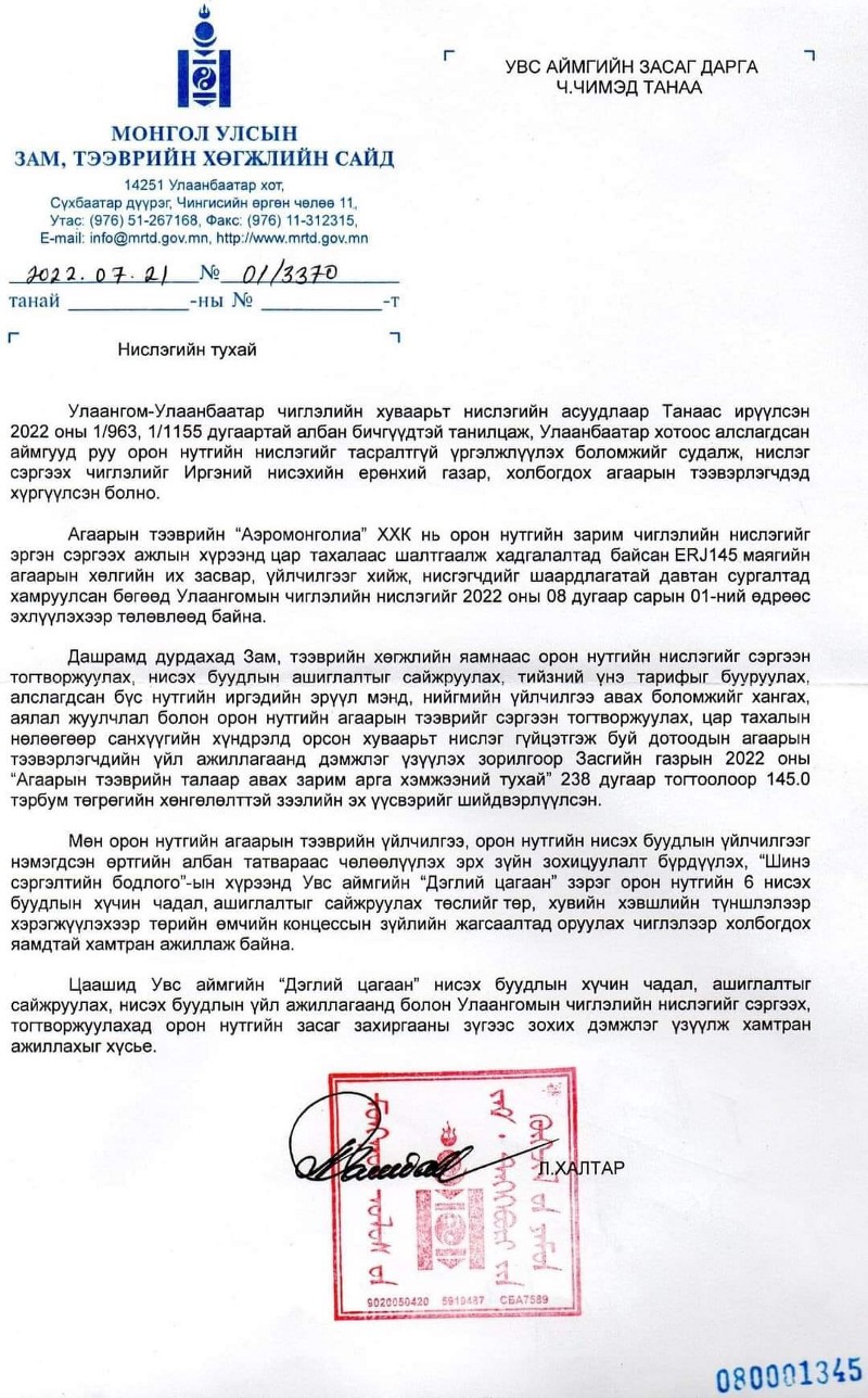Улаангом-Улаанбаатар чиглэлийн хуваарьт нислэгийг 2022 оны наймдугаар сарын 1-нээс эхлүүлэхээр төлөвлөжээ.