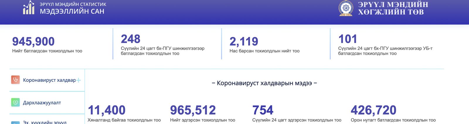 Монгол улсын хэмжээнд сүүлийн 24 цагийн хугацаанд 248 тохиолдол шинээр батлагджээ. Илэрсэн халдварын 101 нь Улаанбаатар хотод,147 нь орон нутагт буюу долоон аймагт тус тус бүртгэгдсэн байна. Ингэснээр нийт бүртгэгдсэн халдварын тоо 945,900 болж нэмэгдэв.