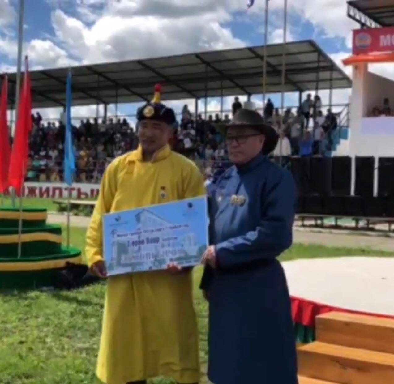 | Сэлэнгэ аймгийнхан Б.Орхонбаяр арсланд "Тоёота Ланд-300" автомашин, гурван өрөө байр, 500 толгой хонь бэлэглэлээ |