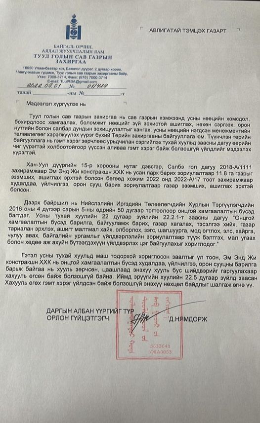 Уг асуудлын талаар Туул голын сав газрын захиргаанаас 2022 оны долдугаар сарын 1-ний өдрийн 01/424 дугаар албан бичгээр ирүүлсэн. Үүнийг 2022 оны долдугаар сарын 6-ны өдөр хүлээн авч, холбогдох мөрдөн шалгах ажиллагааг явуулаад Эрүүгийн хуулийн тусгай ангийн 22.1 дүгээр зүйлийн 1 дэх хэсэгт заасан гэмт хэргийн шинжтэй үндэслэлээр 2021 оны долдугаар сарын 25-ны өдөр хэрэг бүртгэлтийн хэрэг нээж шийдвэрлэсэн болохыг АТГ-с мэдэгджээ.