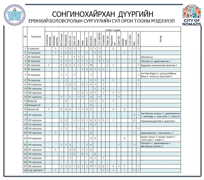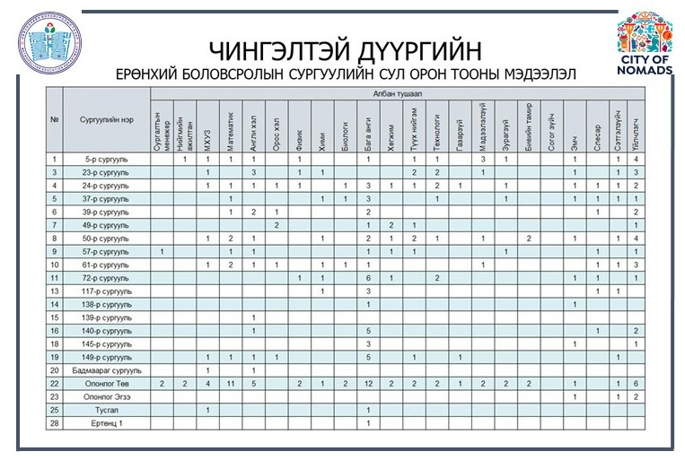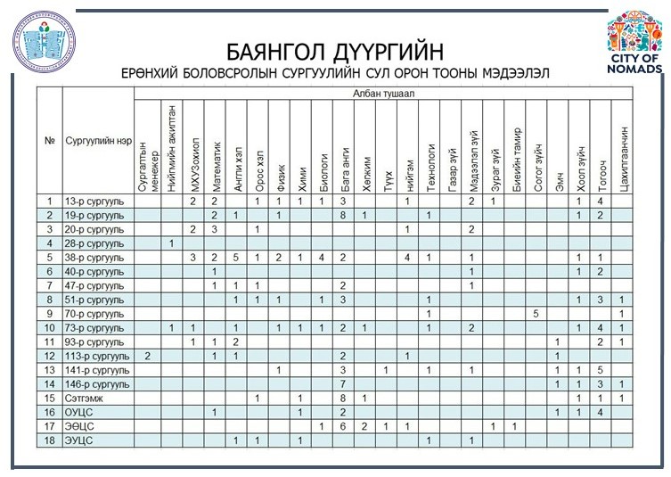 | Нийслэлийн ерөнхий боловсролын 157 сургуульд зарлагдсан сул орон тооны мэдээллийг танилцууллаа |