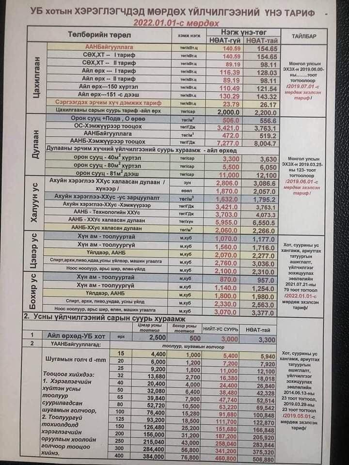 | УС ЦАХИЛГААН, ДУЛААНЫ ҮНИЙН ШИНЭ ТАРИФ |