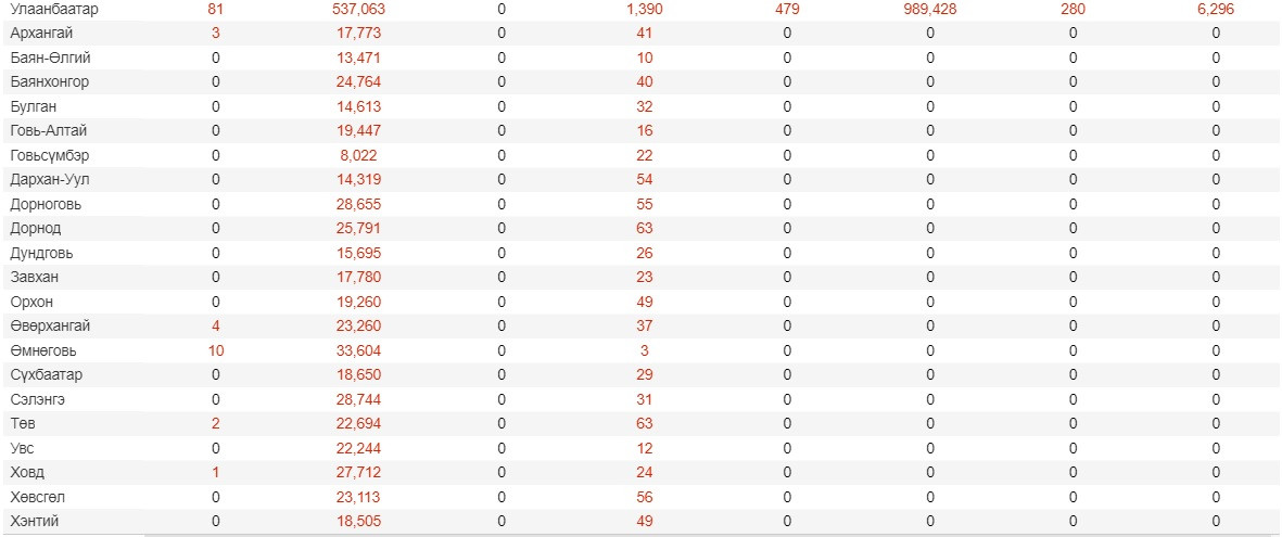 Сүүлийн 24 цагт Улсын хэмжээнд, PCR шинжилгээгээр коронавирусийн 101 тохиолдол батлагджээ. Үүний 81 нь Улаанбаатар хотод, гурав нь Архангай аймагт, арав нь Өмнөговь аймагт, дөрөв нь Өвөрхангай аймагт, хоёр нь Төв аймагт, нэг нь Ховд аймагт бүртгэгдсэн байна. Харин 479 хүн эдгэрч эмнэлгээс гарсан бол, хяналтад 6296 хүн байгаа аж.