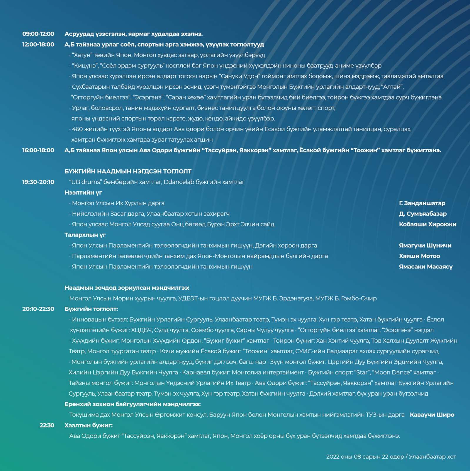 Мөн Япон орны ардын урлаг, өв соёлын нэг болох “Ава одори”, “Ёсакой” бүжгийн урлагаас танилцуулах юм. “Ава Одори” нь ава буюу далайн хөөс, одори буюу бүжиг гэсэн утгатай бөгөөд далайн давлагааны хөөсний хөдөлгөөнөөс санаа авсан, 750 жилийн түүхтэй бүжиг байдаг бол “Ёсакой” нь үндэсний хэв шинжийг чөлөөт хэв маягаар илэрхийлсэн бүжиг ажээ.
