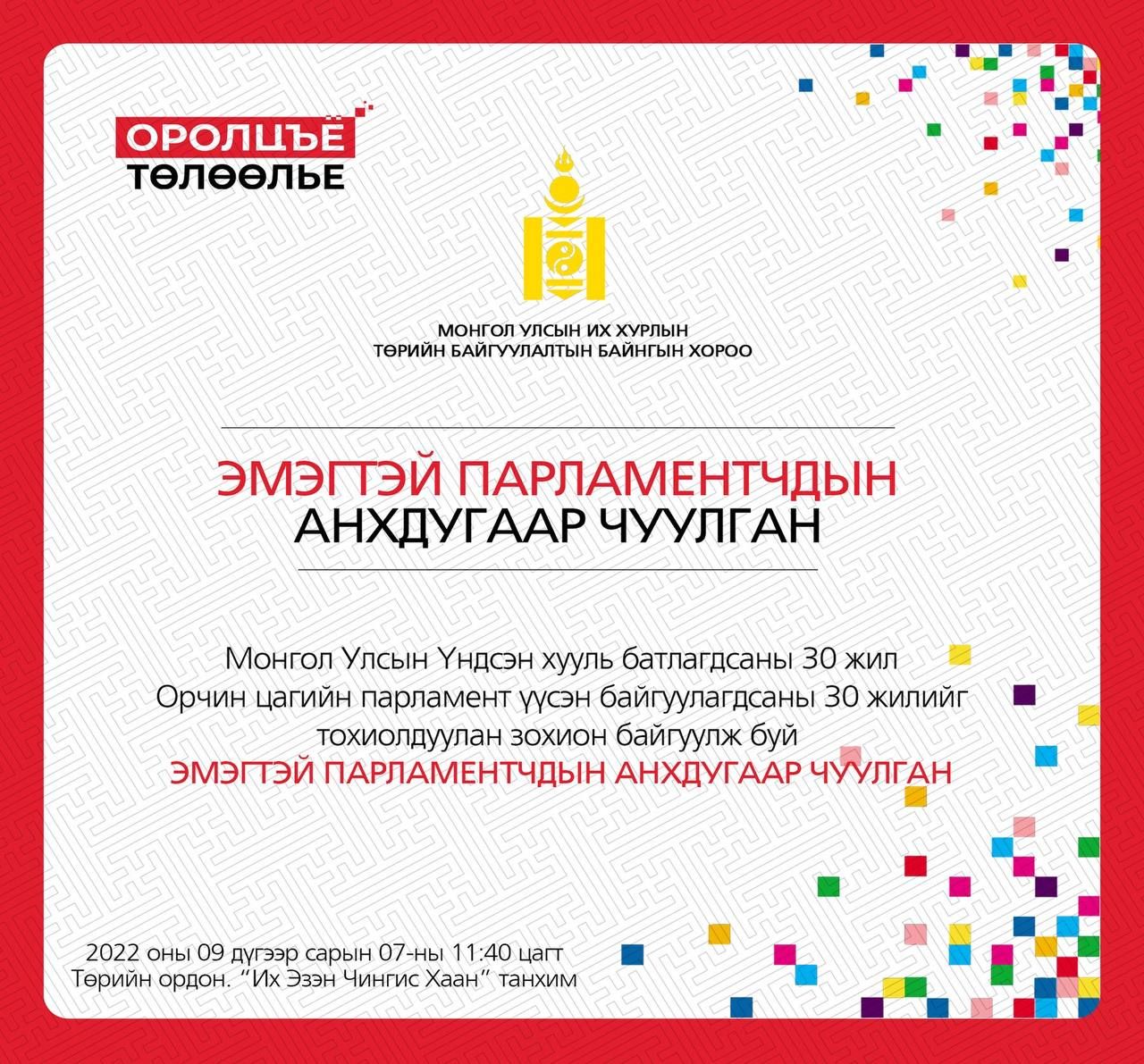 Монгол Улсын Үндсэн хууль батлагдсаны 30 жил, Монгол Улсад орчин цагийн парламент үүсэн байгуулагдсаны 30 жилийн ой энэ онд тохиож буй. Эдгээр ойг тохиолдуулан Улсын Их Хурлын Төрийн байгуулалтын байнгын хороо, НҮБ-ын "Шийдвэр гаргах түвшинд жендэрийн тэгш байдал, эмэгтэйчүүдийн оролцоог дэмжих нь" төсөлтэй хамтран үе үеийн эмэгтэй парламентчдыг оролцуулсан “Эмэгтэй парламентчдын анхдугаар чуулган”-ыг 2022 оны есдүгээр сарын 7-ны өдөр Төрийн ордонд зохион байгуулах гэж байна.