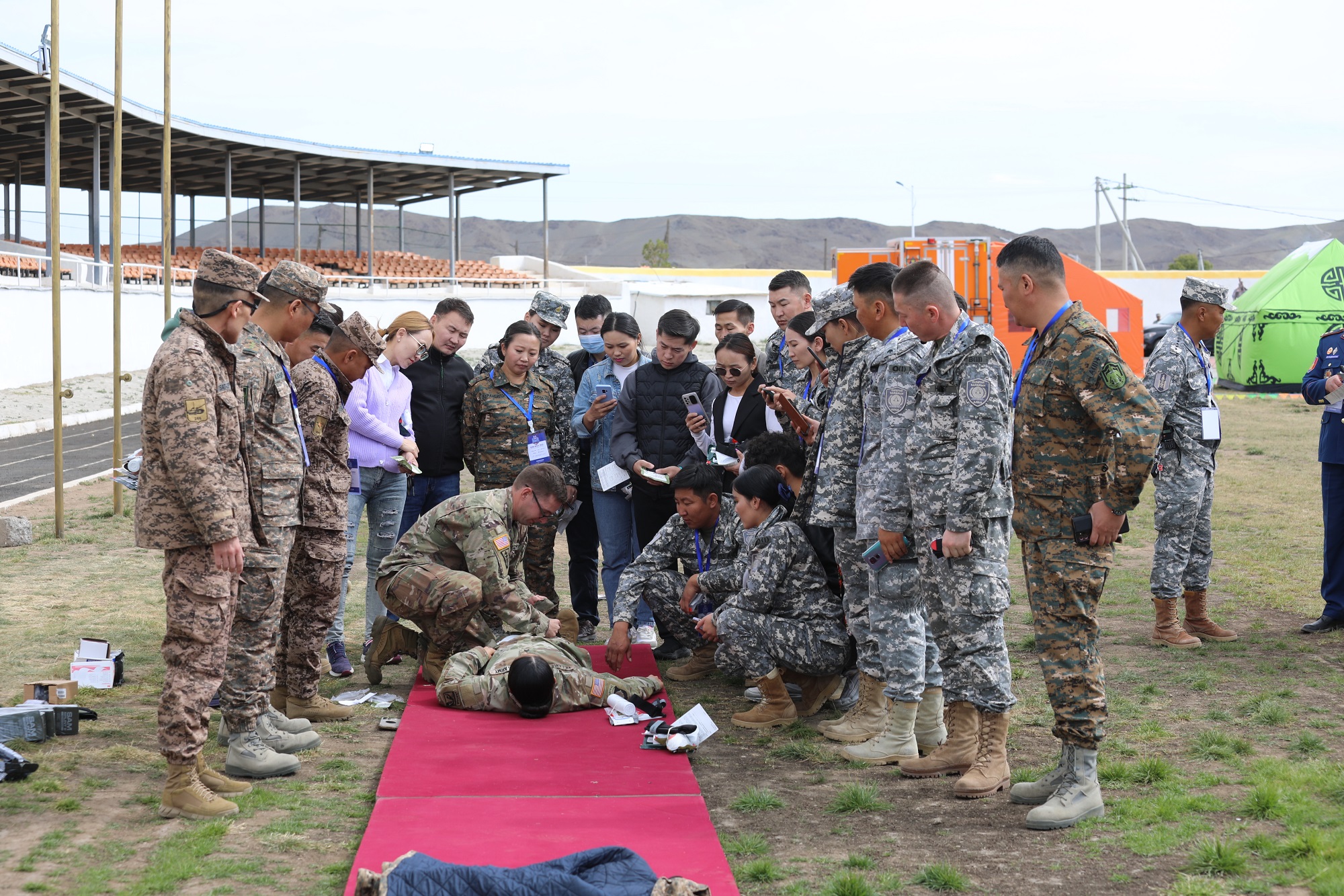 Гамшгийн хор уршгийг арилгах “Говийн чоно-2022” олон улсын сургалт, дадлага сургуулийн хүрээнд Онцгой байдлын байгууллага II шатлалын хээрийн эмнэлгээ дэлгэж, олон нийтийг хамарсан гамшиг ослын үед ажиллах дадлага сургуулийг хийж байна.