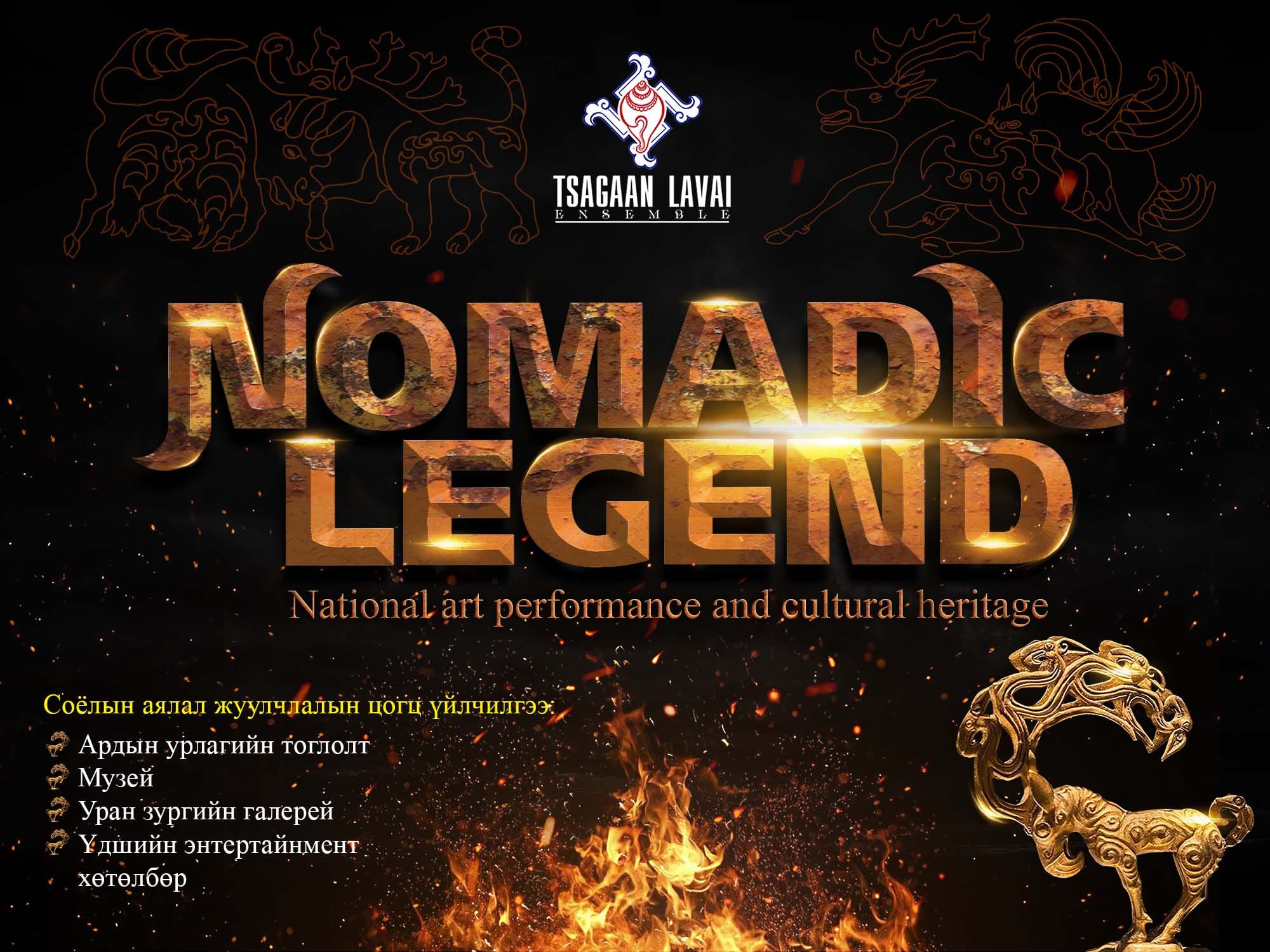 Цагаан лавай чуулгын "Nomadic Legend" ардын урлаг, өв соёлын тоглолт 18:00 цагт тоглогдох байна. Уг тоглолт нь үндэсний урлагийн бүхий л үзүүлбэрүүд багтах бөгөөд ардын хөгжмийн хамтлаг, ардын бүжиг, бие биелгээ, хөөмий, магтаал, морин хуур, цамын бүжиг, уртын болон ардын дуу, уран нугаралт гээд ардын урлагийн цогц хөтөлбөртэй тоглолт юм.й
