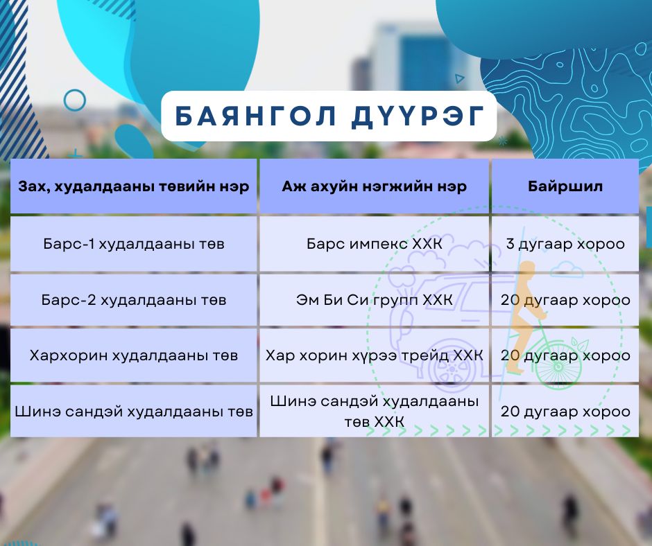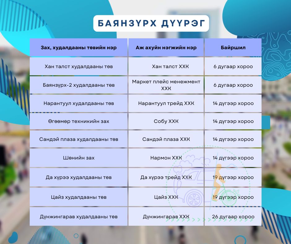 Нийслэлийн Засаг даргын Хэвлэлийн төлөөлөгч “Автомашингүй өдөр Чингэлтэй, Баянзүрх, Сүхбаатар, Баянгол дүүрэгт орших 19 томоохон зах, худалдааны төв болон Зуун айл орчмын барилгын материалын бүх дэлгүүр амарна” хэмээн мэдэгдсэн.