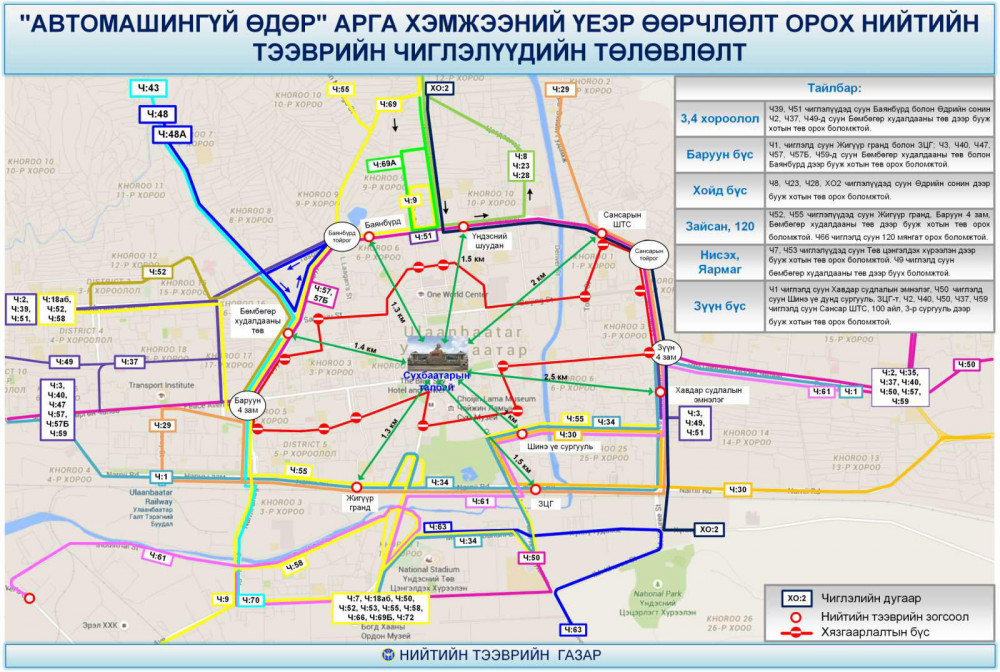 Хотын төвийн буюу Их тойруу доторх гол гудамж, замууд хаагдах үед нийтийн зорчигч тээврийн үйлчилгээний чиглэлүүд хойгуураа Их тойруугийн гудамж, урдуур Нарны зам, Намъяанжугийн гудамжаар явах бөгөөд хойноос урагш болон урдаас хойш явдаг босоо чиглэлүүд Баруун 4 зам, Нарны гүүр, Зүүн 4 замаар үйлчилж 18:00 цагаас хойш үндсэн замналаар үйлчилгээ үргэлжилнэ.