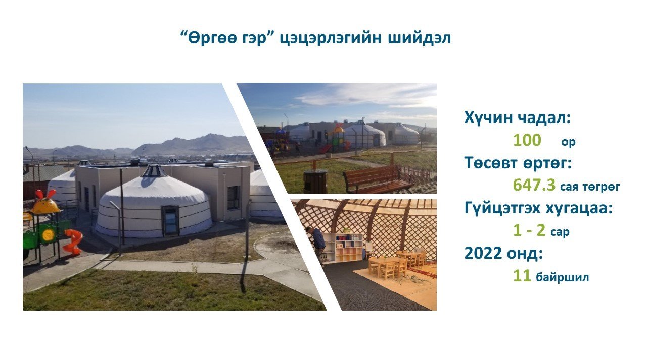 Цэцэрлэгийн хүртээмжийг сайжруулах ажлын хүрээнд өргөө гэр цэцэрлэг, түрээсийн байр, шинэ обьект худалдан авах, байгууллагын цэцэрлэг зэрэг олон хэлбэрээр цэцэрлэгийн тоог нэмэгдүүлэн ажиллаж байгаа. Тодруулбал: