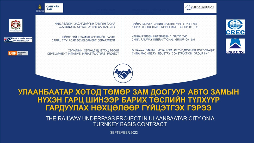 НЗДТГ-ын даргын албан үүргийг түр орлон гүйцэтгэгч И.Баатархүү “Улаанбаатар хотын дөрвөн байршилд төмөр зам доогуур авто замын нүхэн гарц шинээр барих төсөл”-ийн ажлын зураг төсөл боловсруулах, барилга угсралтын ажлыг гүйцэтгэх түлхүүр гардуулах нөхцөлтэй гэрээнд гарын үсэг зурлаа. Тус төсөл нь БНХАУ-ын Засгийн газрын хөнгөлөлттэй зээлийн хөрөнгөөр “Хөгжлийн хөтөч-дэд бүтэц” төслийн хүрээнд хэрэгжих юм. Энэ үеэр талууд нийслэлийн гол дөрвөн байршилд босоо чиглэлд автомашины хөдөлгөөнийг задлах, урсгалыг нэмэгдүүлэхэд нэн чухал ач холбогдолтойг онцлоод, хэрэгжилтийг онцгой анхаарч хамтран ажиллана" гэв.