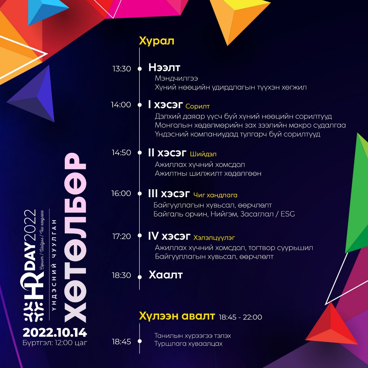“СОРИЛТ-ШИЙДЭЛ-ЧИГ ХАНДЛАГА” сэдвийн хүрээнд зохион байгуулж буй энэ жилийн чуулган дотоод, гадаадын судалгааны байгууллагууд, их дээд сургуулиудын удирдлага, үндэсний компаниуд, аж ахуйн нэгжүүдийн гүйцэтгэх удирдлагууд, хүний нөөцийн салбарын мэргэжилтнүүд нэгдэн, хамтдаа хүний нөөцийн салбарт тулгарч буй асуудлыг тодорхойлж, тэргүүн туршлагаа хуваалцан шийдэлд хүрэх замаар салбарын цаашдын чиг хандлагыг тодорхойлох зорилготой юм. Чуулганаар ажиллах хүчний хомсдол, ажилтны тогтвор суурьшил, байгууллагын дижитал шилжилт, байгаль орчин, нийгмийн харилцаа болон компанийн засаглал зэрэг мэргэжилтнүүдийн анхаарлыг татсан сэдвээр хэлэлцүүлэгт оролцох боломжтой.